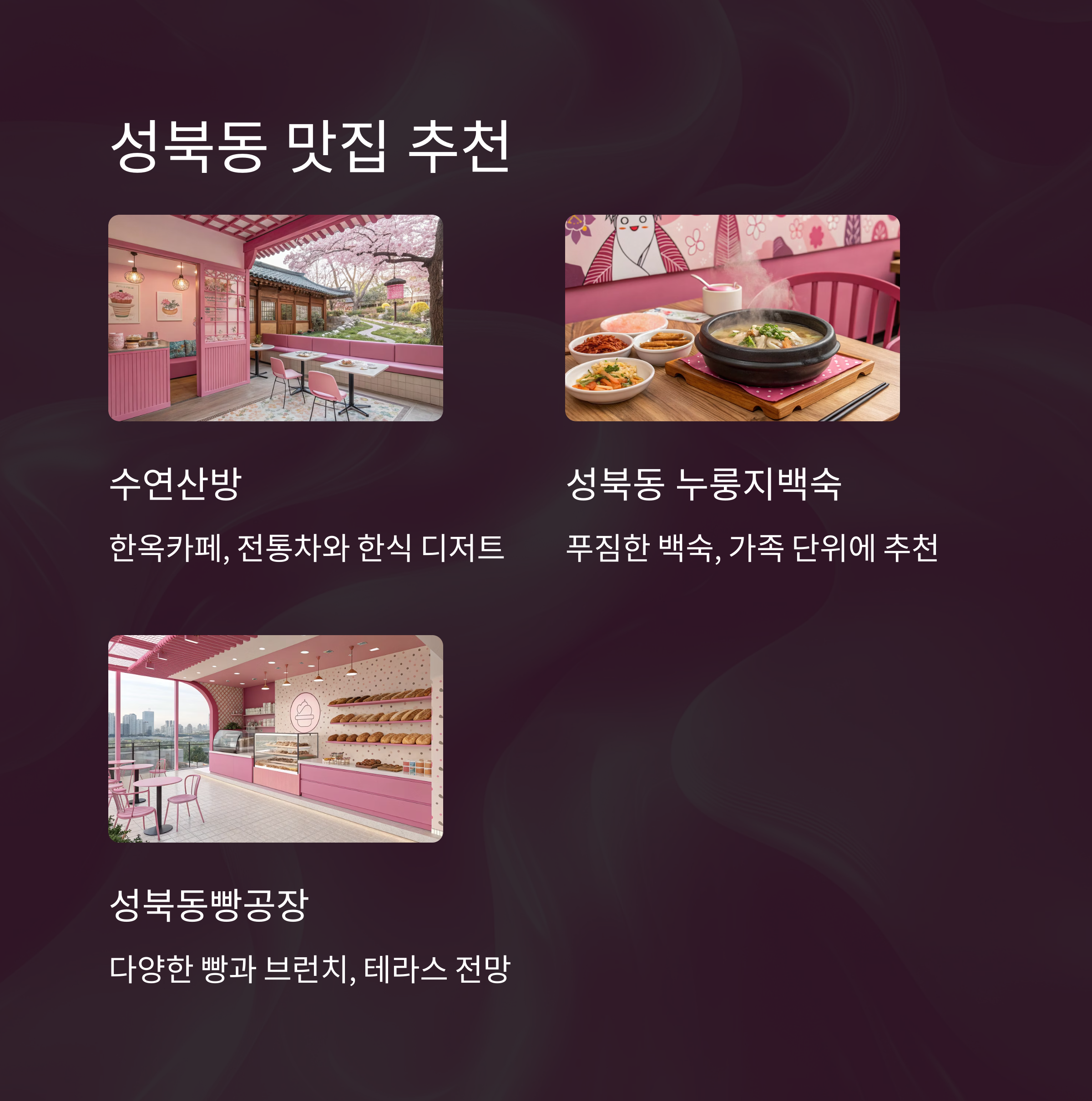 - 수연산방(한옥카페, 전통차), 성북동 누룽지백숙(백숙), 성북동빵공장(빵, 브런치)