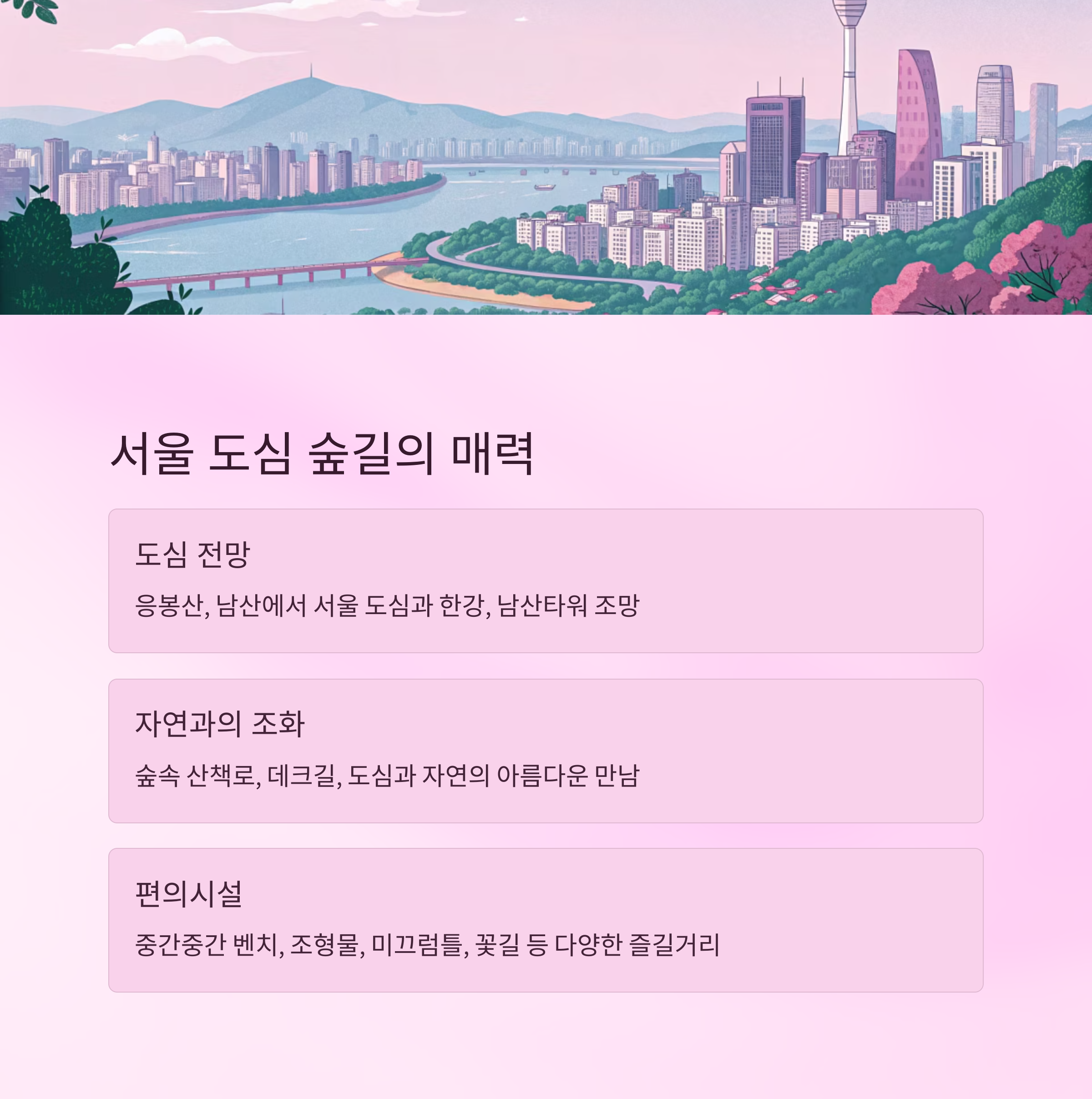 - "서울 도심 한가운데서 만나는 원시림 같은 숲길, 전망대에서 보는 서울 전경이 압도적이다."