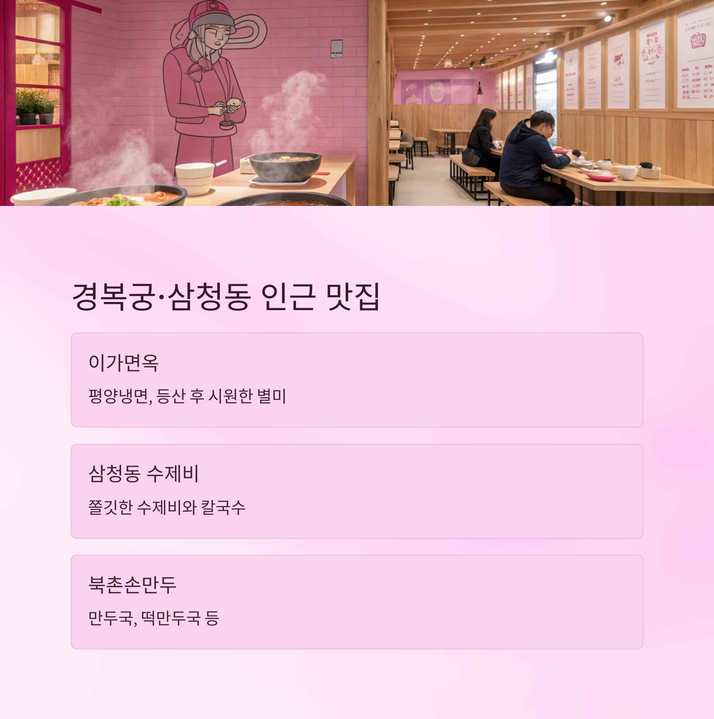 - 이가면옥(평양냉면), 삼청동 수제비(수제비), 북촌손만두(만두국)