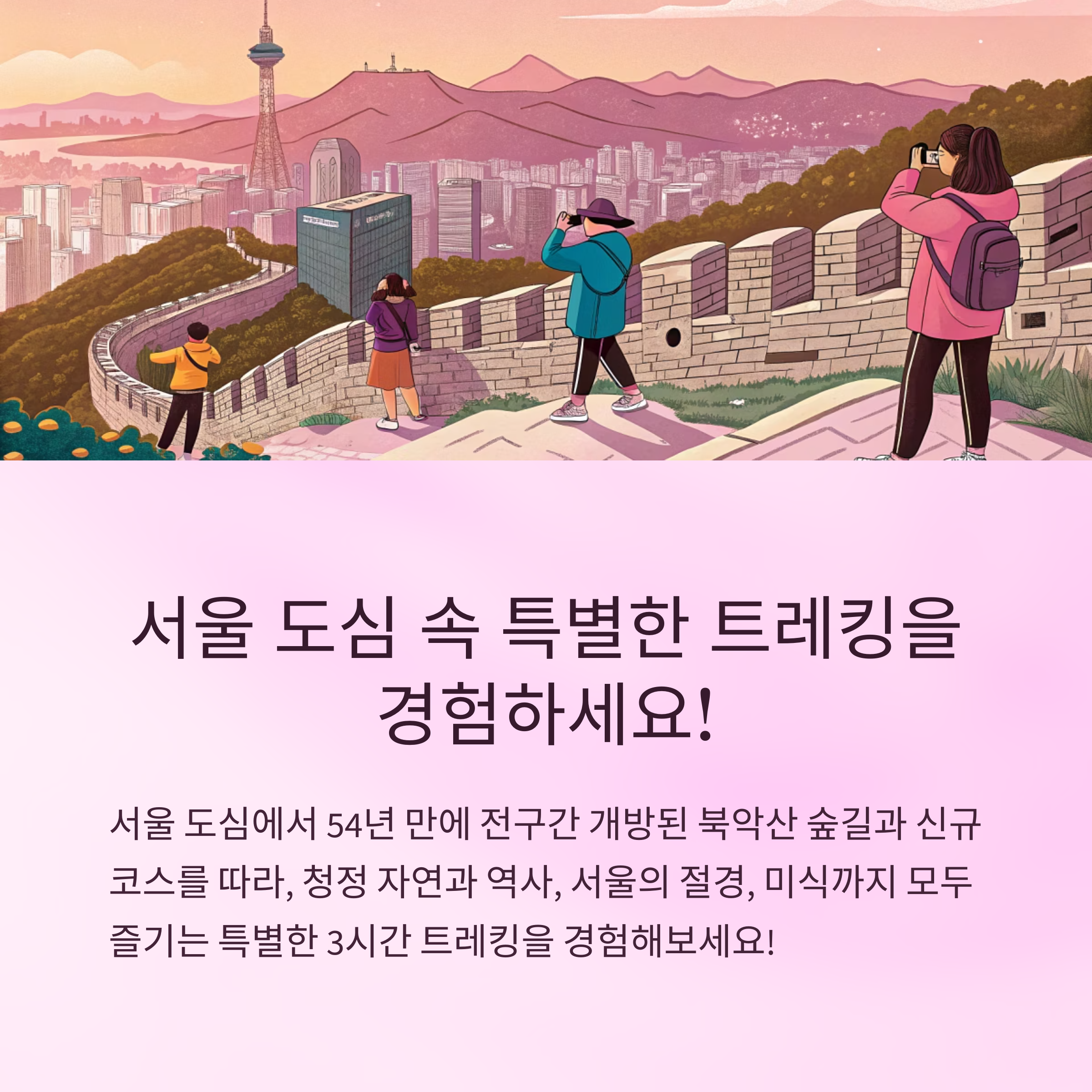 서울 도심에서 54년 만에 전구간 개방된 북악산 숲길과 신규 코스를 따라, 청정 자연과 역사, 서울의 절경, 미식까지 모두 즐기는 특별한 3시간 트레킹을 경험해보세요!