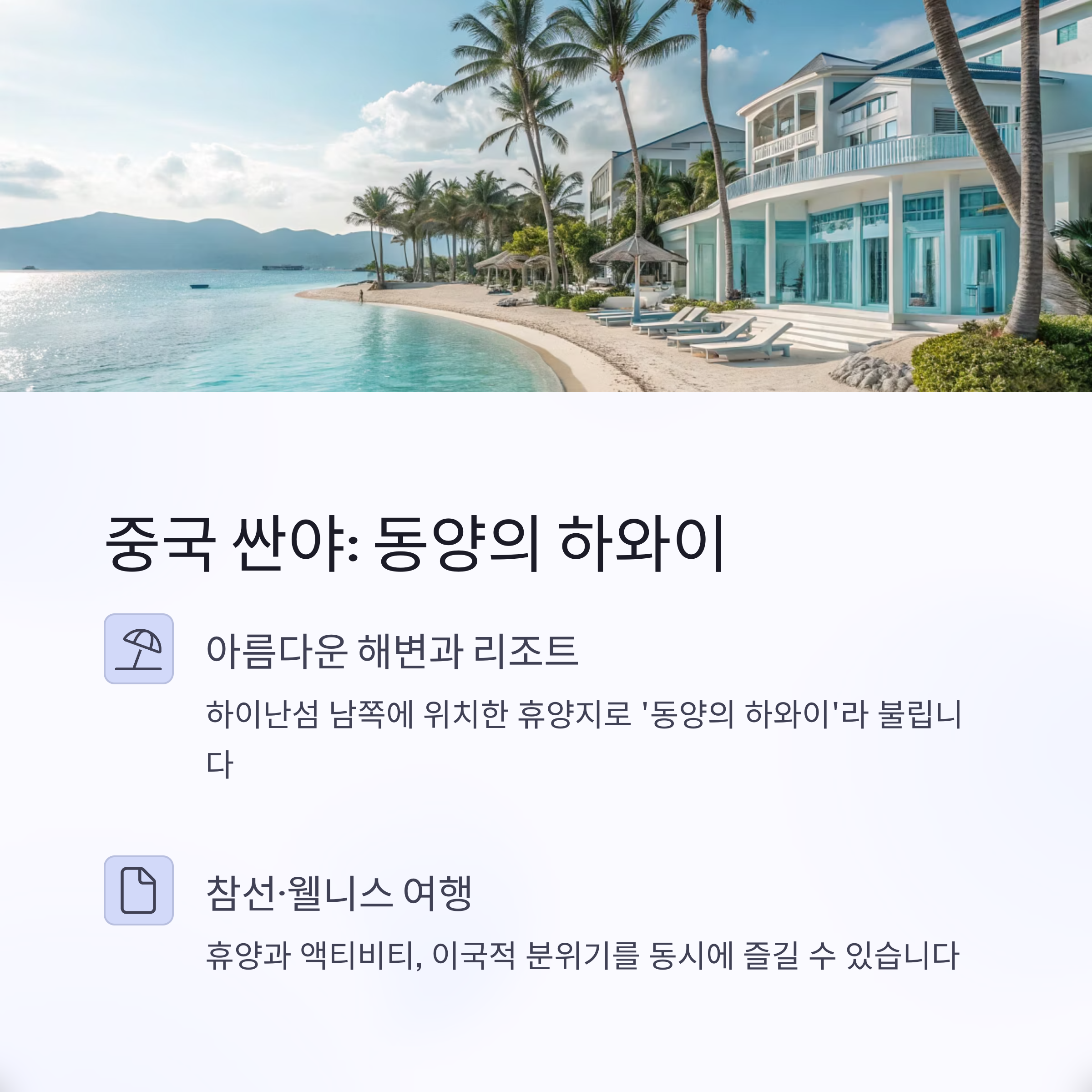 - 왜 추천?: 최근 중국 내외 젊은 여행자들에게 인기 급상승. 휴양과 액티비티, 이국적 분위기를 동시에 즐길 수 있습니다.