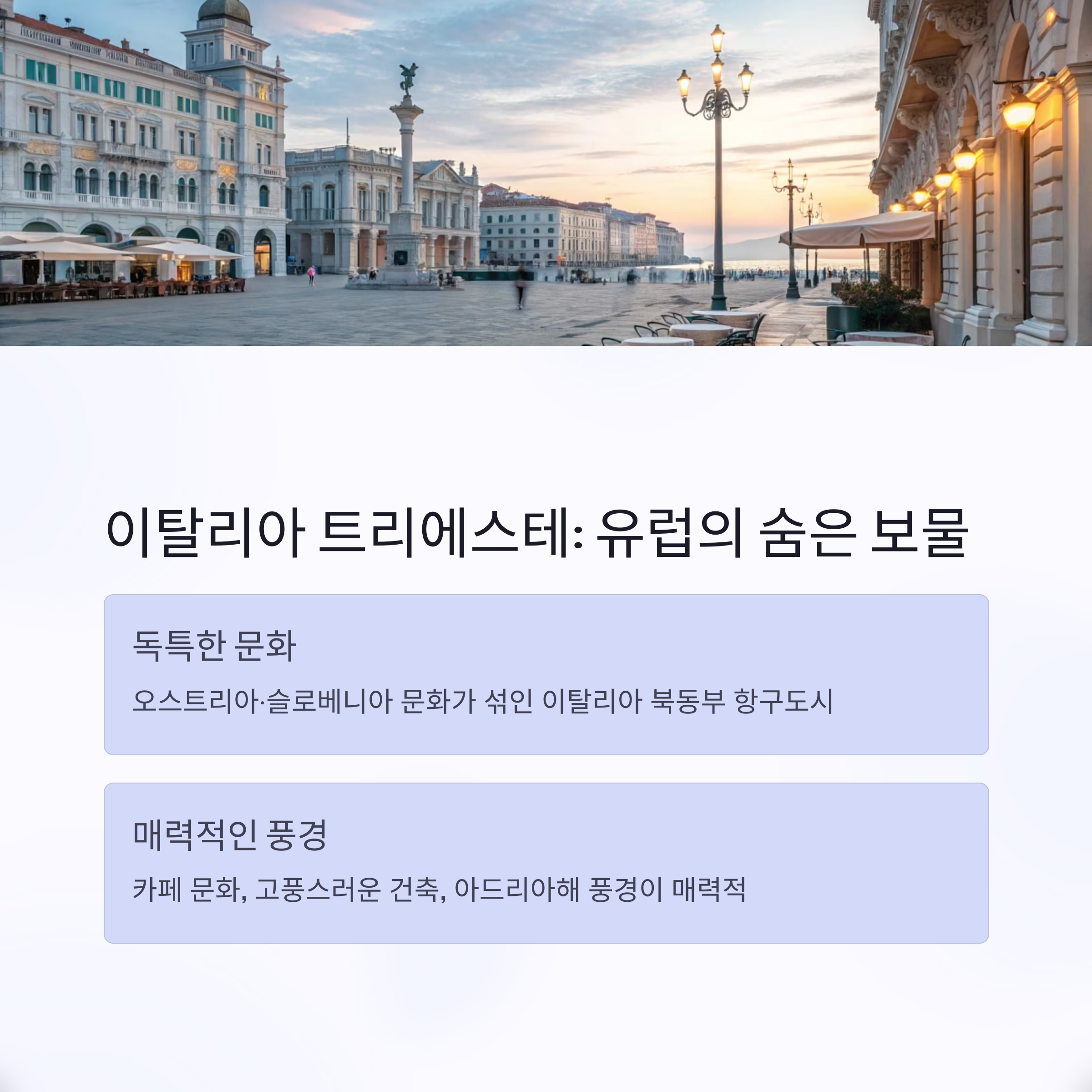 - 특색: 오스트리아·슬로베니아 문화가 섞인 이탈리아 북동부 항구도시. 카페 문화, 고풍스러운 건축, 아드리아해 풍경이 매력적입니다.
