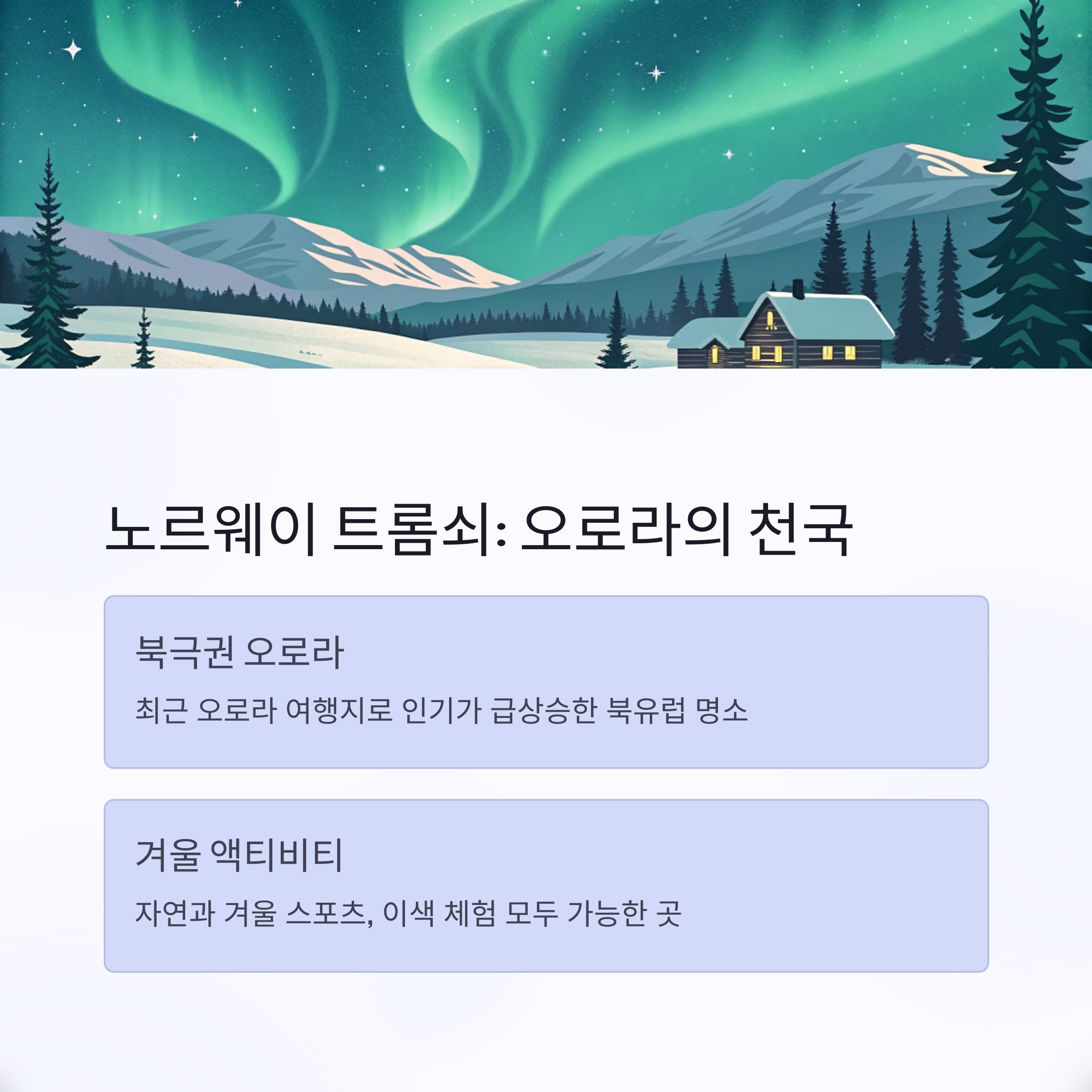 - 왜 추천?: 최근 오로라 여행지로 인기가 급상승. 자연과 겨울 스포츠, 이색 체험 모두 가능.