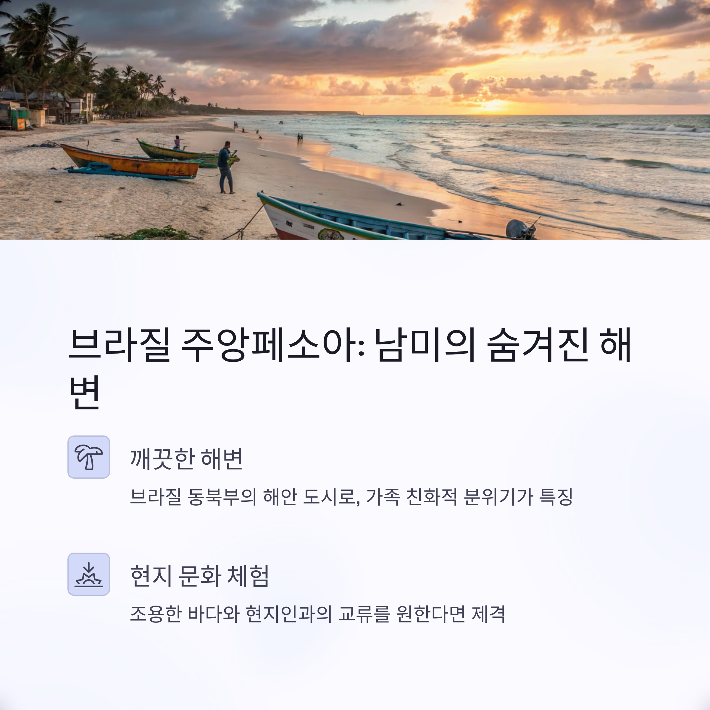 - 왜 추천?: 남미에서 아직 덜 알려진 휴양지로, 조용한 바다와 현지인과의 교류를 원한다면 제격.