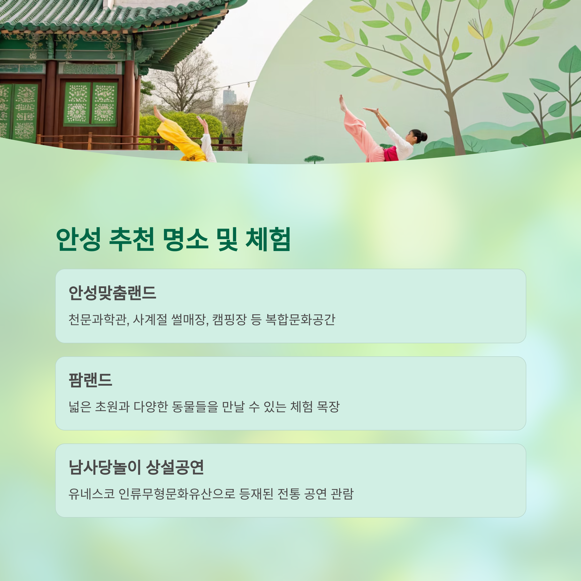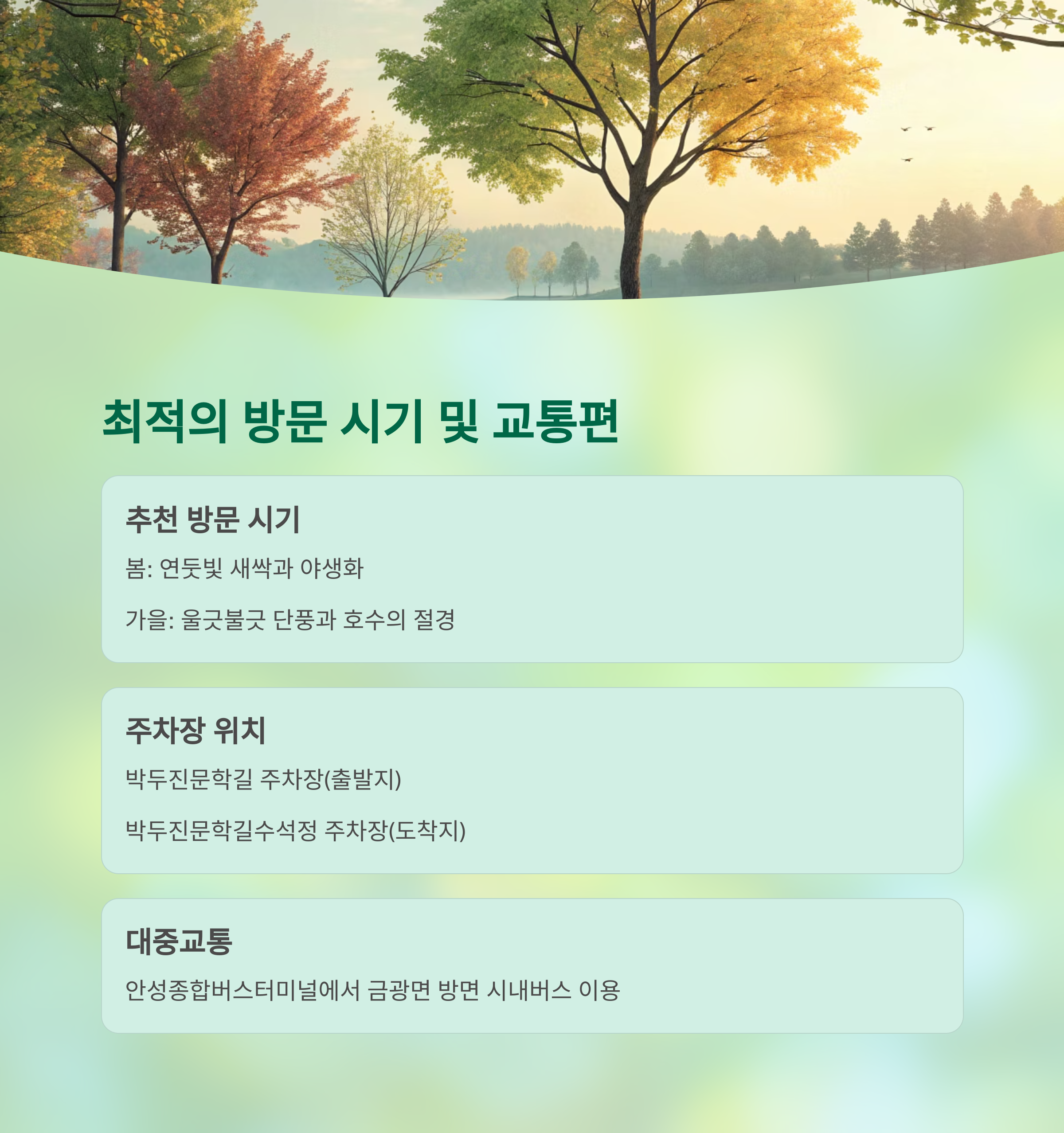 - 🌳 주변 명소: 안성맞춤랜드, 팜랜드, 고삼호수, 남사당놀이, 칠장사 등