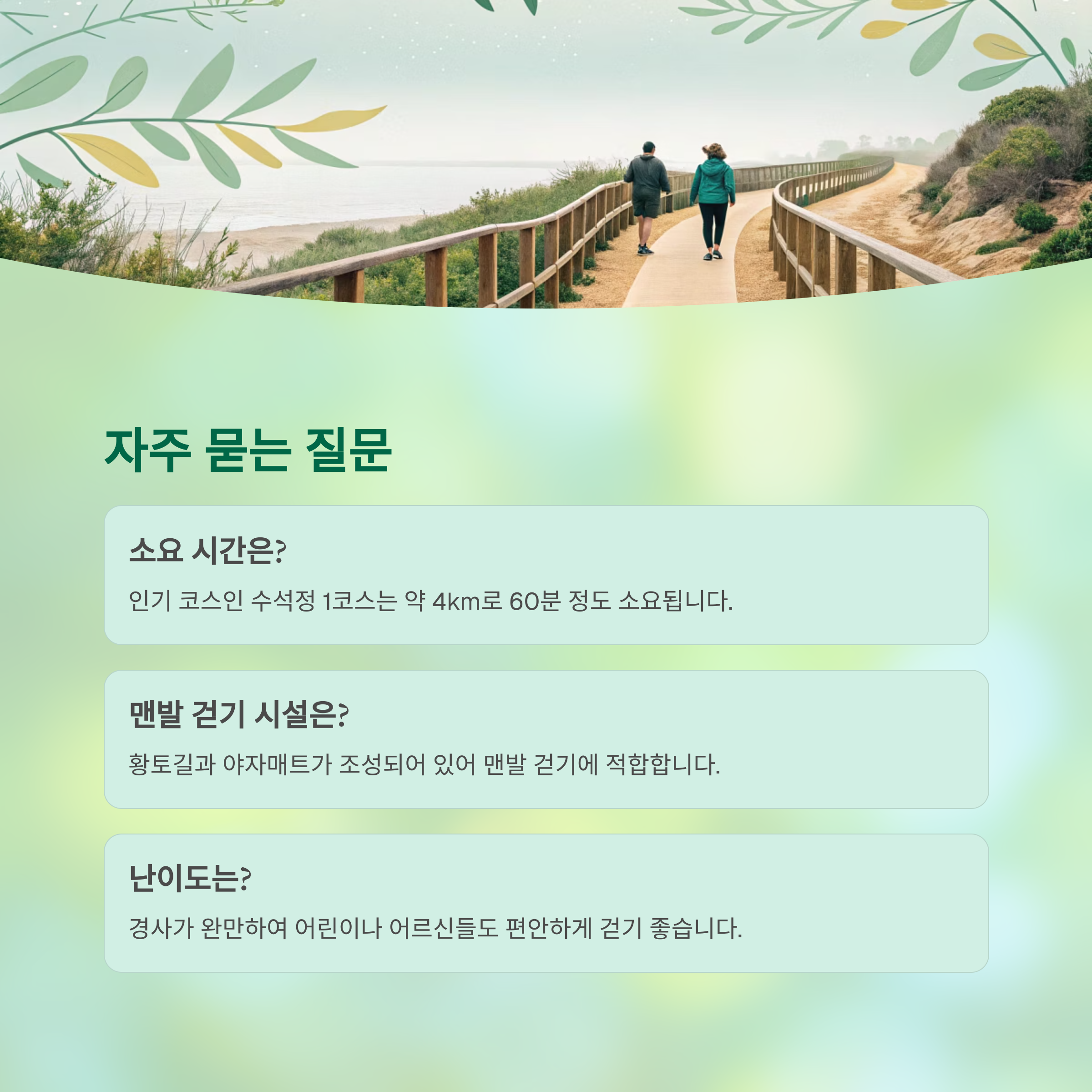 - 🗓️ 추천 시기: 걷기 좋은 봄과 가을 (맨발 걷기 추천)