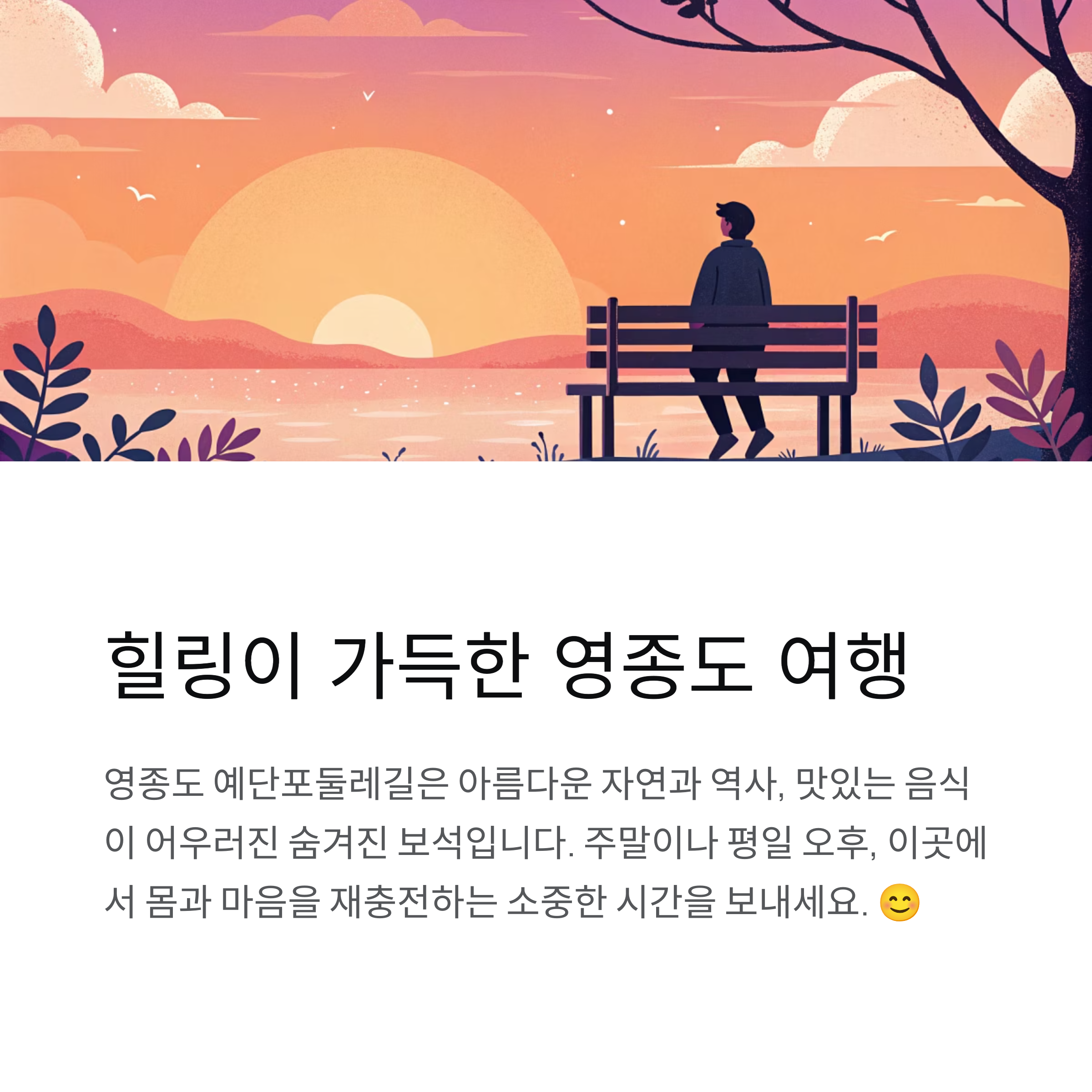 영종도 예단포둘레길은 아름다운 자연과 역사, 그리고 맛있는 음식이 어우러져 완벽한 하루를 선사하는 숨겨진 보석 같은 곳입니다. 주말이나 평일 오후, 잠시의 여유를 찾아 이곳을 방문하여 몸과 마음을 재충전하는 소중한 시간을 보내시길 바랍니다. 힐링이 가득한 영종도 여행 되세요! 😊