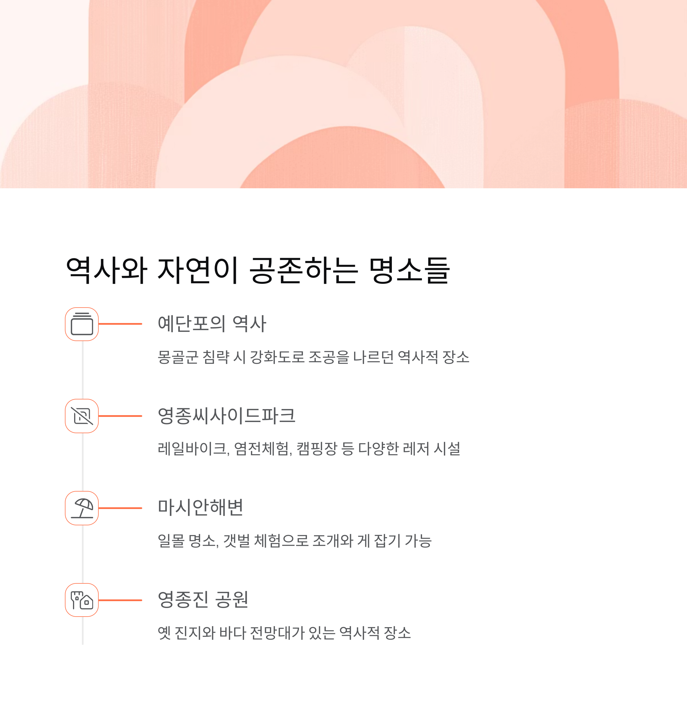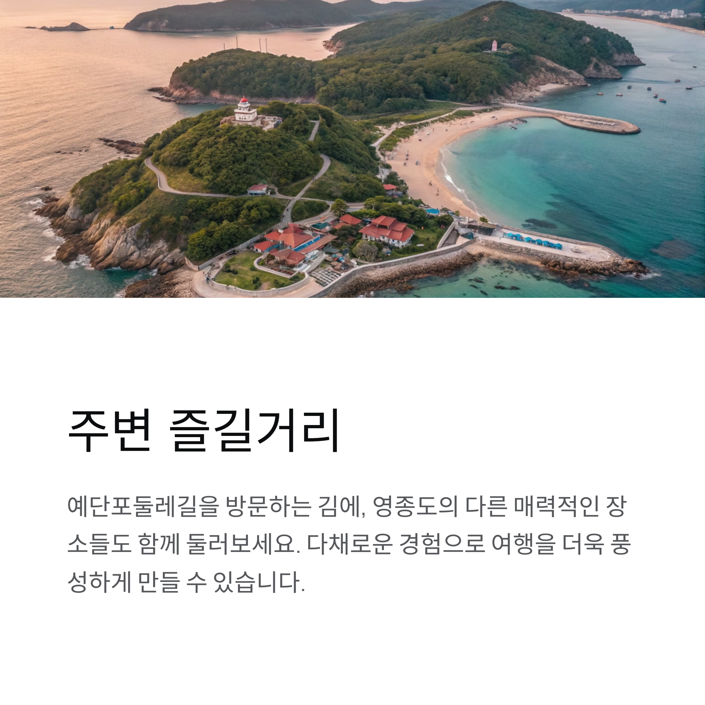 예단포둘레길을 방문하는 김에, 영종도의 다른 매력적인 장소들도 함께 둘러보는 것을 추천합니다. 다채로운 경험으로 여행을 더욱 풍성하게 만들 수 있습니다.