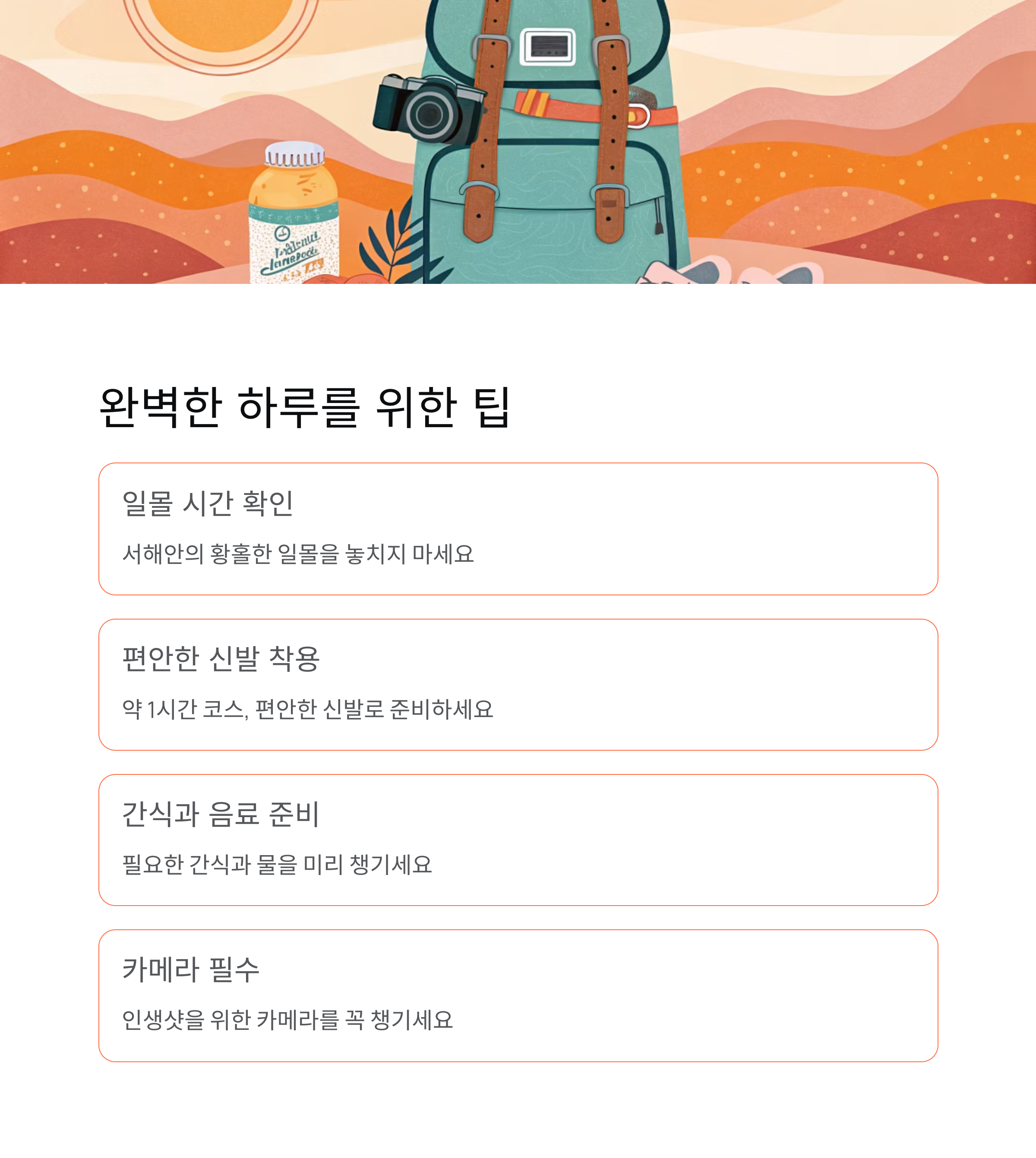 - 일몰 시간 확인: 서해안의 일몰은 특히 아름답습니다. 방문 전 일몰 시간을 확인하고 그에 맞춰 둘레길을 걸으면 잊지 못할 풍경을 만날 수 있습니다.