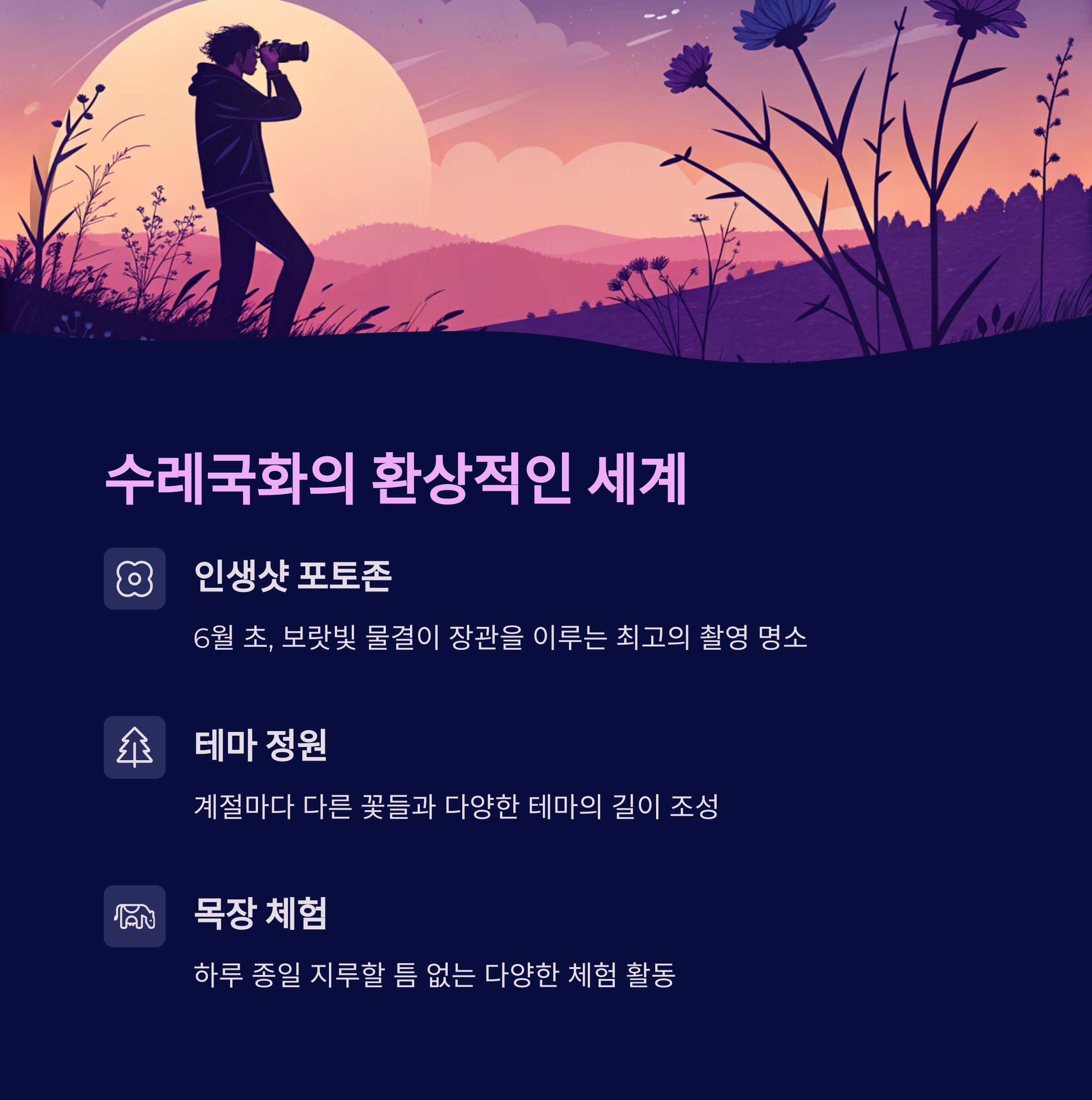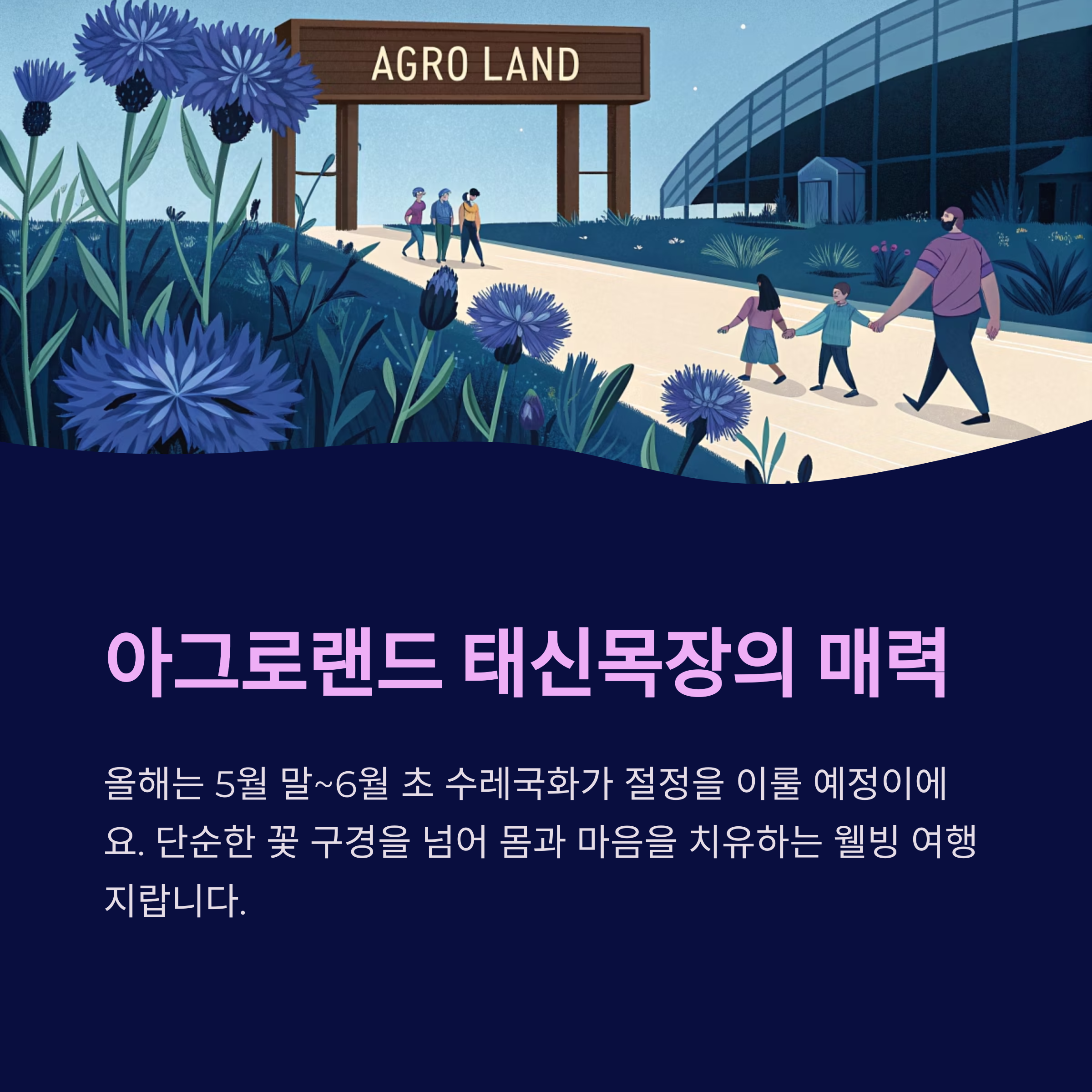 특히 충남 예산에 위치한 **아그로랜드 태신목장**은 이 수레국화를 가장 아름답게 만날 수 있는 대표 명소인데요. 작년에는 6월 1일경 만개했지만, 올해는 5월 말에서 6월 초 사이에 절정을 이룰 것으로 예상된다고 하니, 서둘러 준비해야겠죠? 아그로랜드는 단순한 꽃 구경을 넘어, 몸과 마음을 치유하고 삶의 질을 높이는 웰빙 여행지로도 손색이 없어요. 지금부터 제가 직접 경험한 아그로랜드의 매력과 주변 알짜 정보를 아낌없이 소개해 드릴게요! 🌿