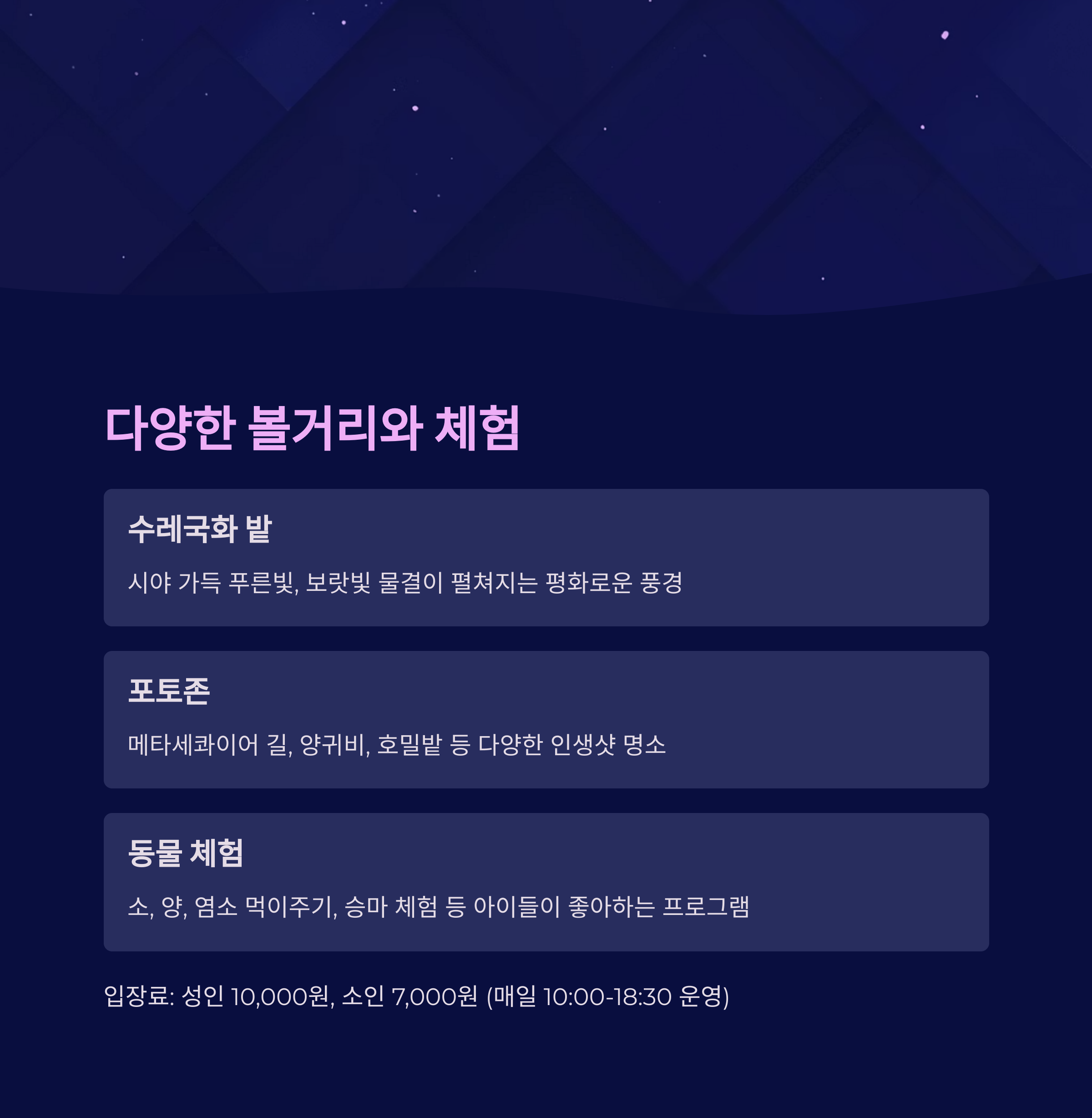 - 다양한 포토존: 수레국화 외에도 메타세콰이어 길, 양귀비, 호밀밭 등 계절에 따라 다양한 꽃과 테마가 바뀌어 방문할 때마다 새로운 인생 사진을 남길 수 있어요.