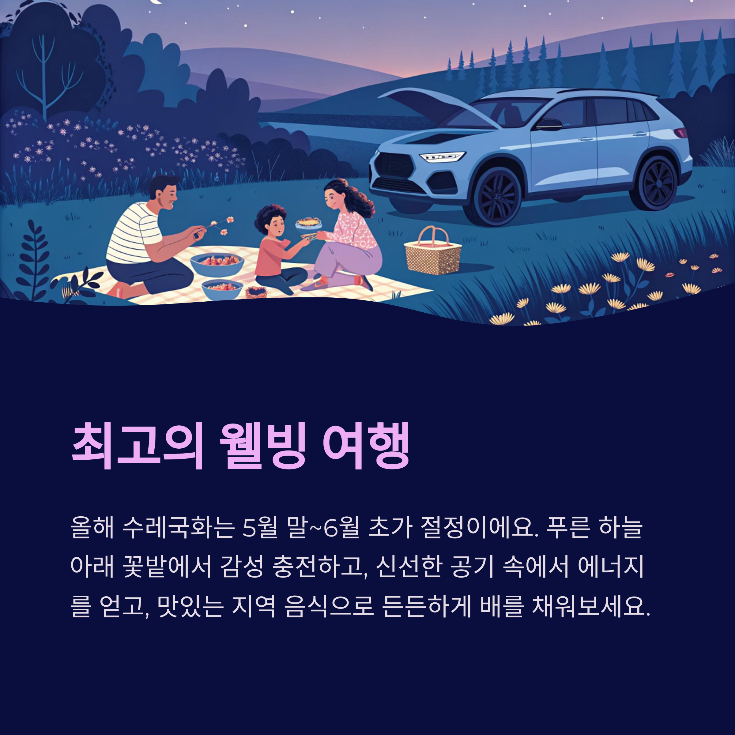 6월, 꽃의 제왕 수레국화가 아름답게 피어나는 아그로랜드 태신목장은 단순한 관광지를 넘어 몸과 마음의 웰빙을 동시에 잡을 수 있는 최고의 여행지입니다. 푸른 하늘 아래 펼쳐진 꽃밭에서 감성 충전하고, 신선한 공기 속에서 에너지를 얻고, 맛있는 지역 음식으로 든든하게 배를 채운다면 진정한 힐링이 무엇인지 느끼실 수 있을 거예요.