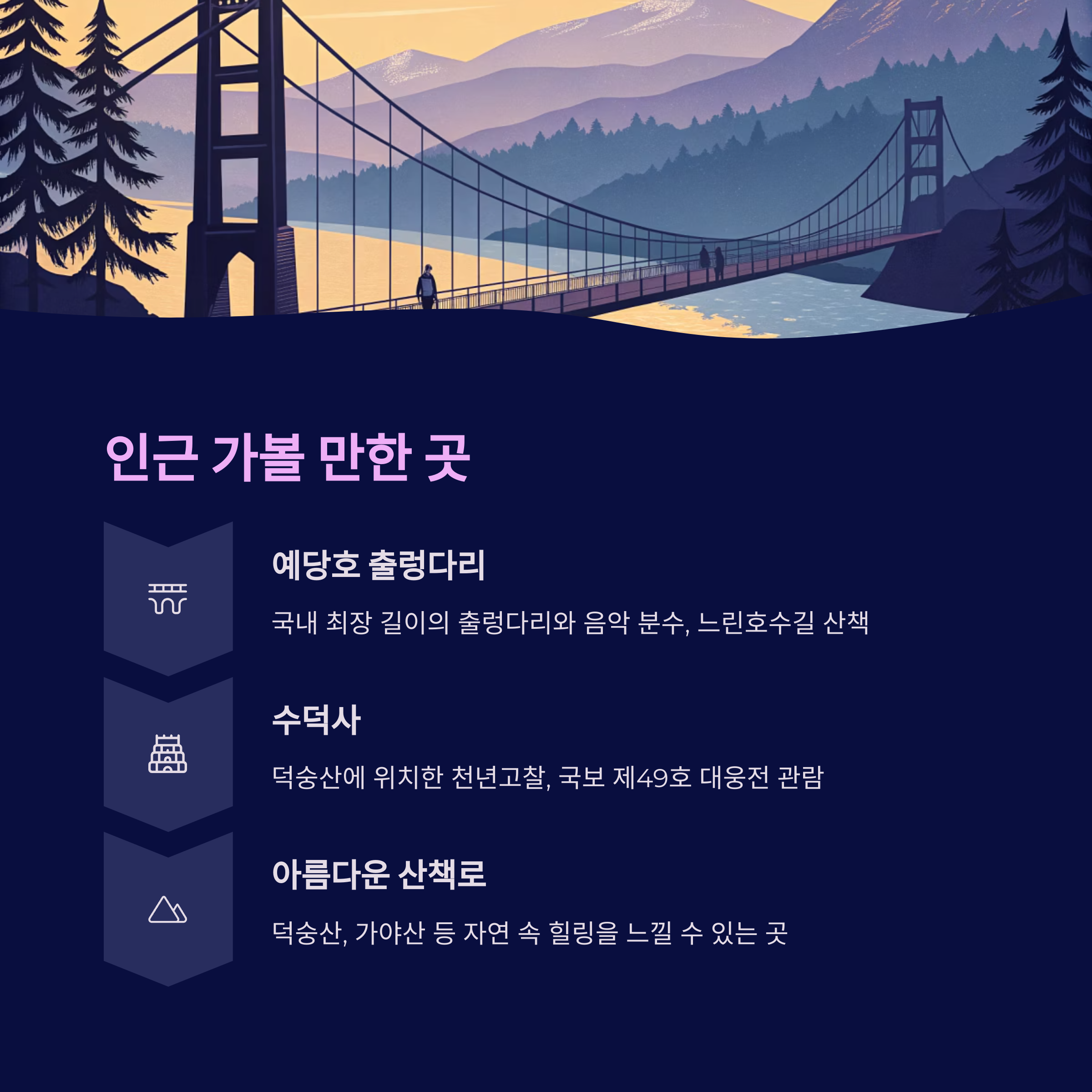 - 예당호 출렁다리 & 느린호수길: 국내 최장 길이의 출렁다리로, 스릴과 함께 예당호의 아름다운 풍경을 감상할 수 있습니다. 다리 건너편에는 느린호수길이 조성되어 있어 가볍게 산책하며 자연을 만끽하기 좋습니다. 음악 분수도 유명하니 저녁 시간에 맞춰 방문하는 것도 추천해요!