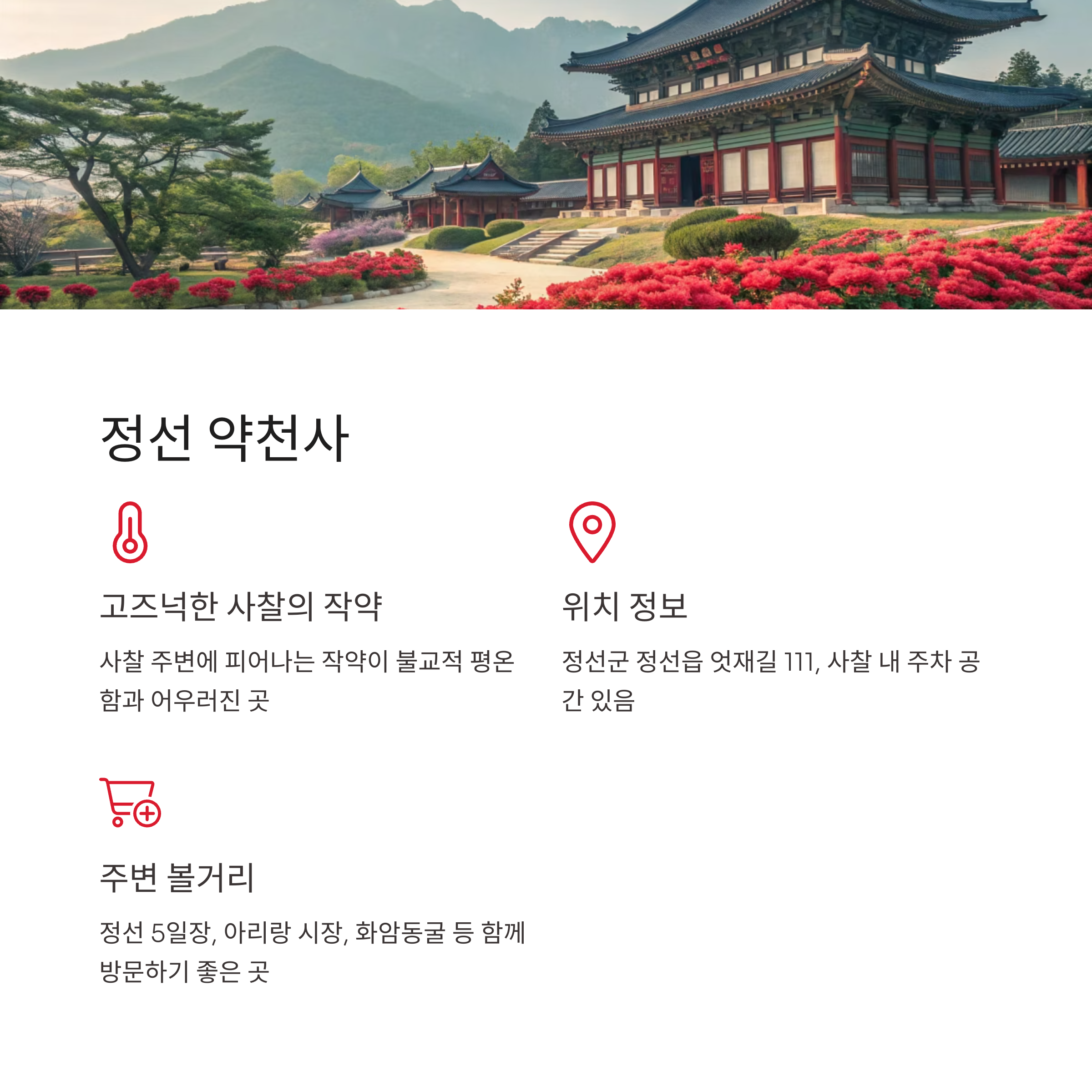 - 인근 추천 맛집: 정선읍 내에는 곤드레밥, 황기족발 등 정선 특산물을 활용한 맛집들이 많습니다. '동광식당', '회동집' 등이 유명합니다.