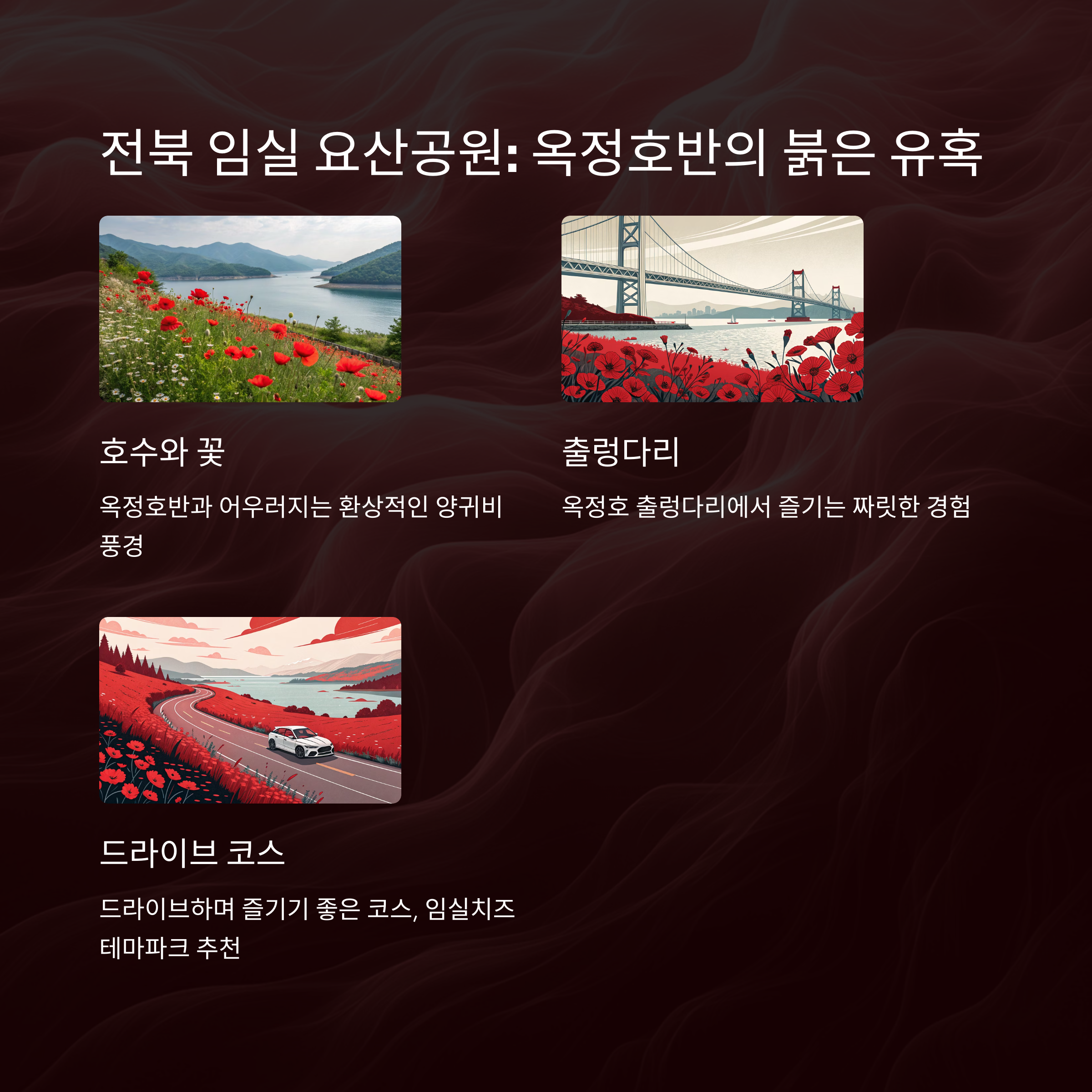 임실 요산공원은 옥정호반에 위치한 아름다운 공원으로, 호수 풍경과 함께 계절마다 다양한 꽃을 감상할 수 있습니다. 5월에는 양귀비꽃이 피어나 호수와 어우러지는 환상적인 풍경을 연출합니다. "옥정호가 정말 멋있고, 양귀비꽃까지 더해지니 최고였어요!", "사진 찍기 좋은 포인트가 많아요"라는 후기가 많았어요. 드라이브 코스로도 강추합니다! 🚗