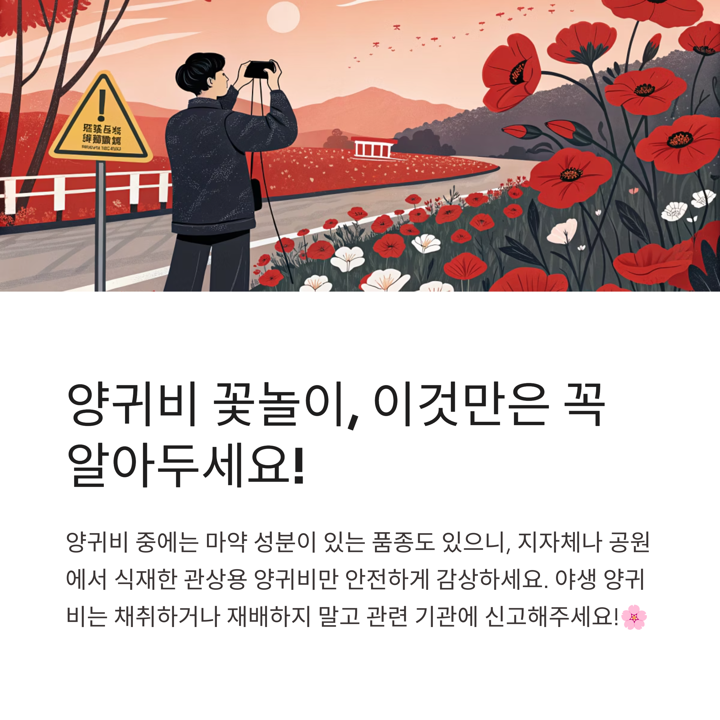 양귀비 중에는 마약 성분이 있는 품종도 있으니, 지자체나 공원에서 식재한 관상용 양귀비만 안전하게 감상하시고, 야생 양귀비를 발견하면 절대 채취하거나 재배하지 마시고 관련 기관에 신고해 주세요!