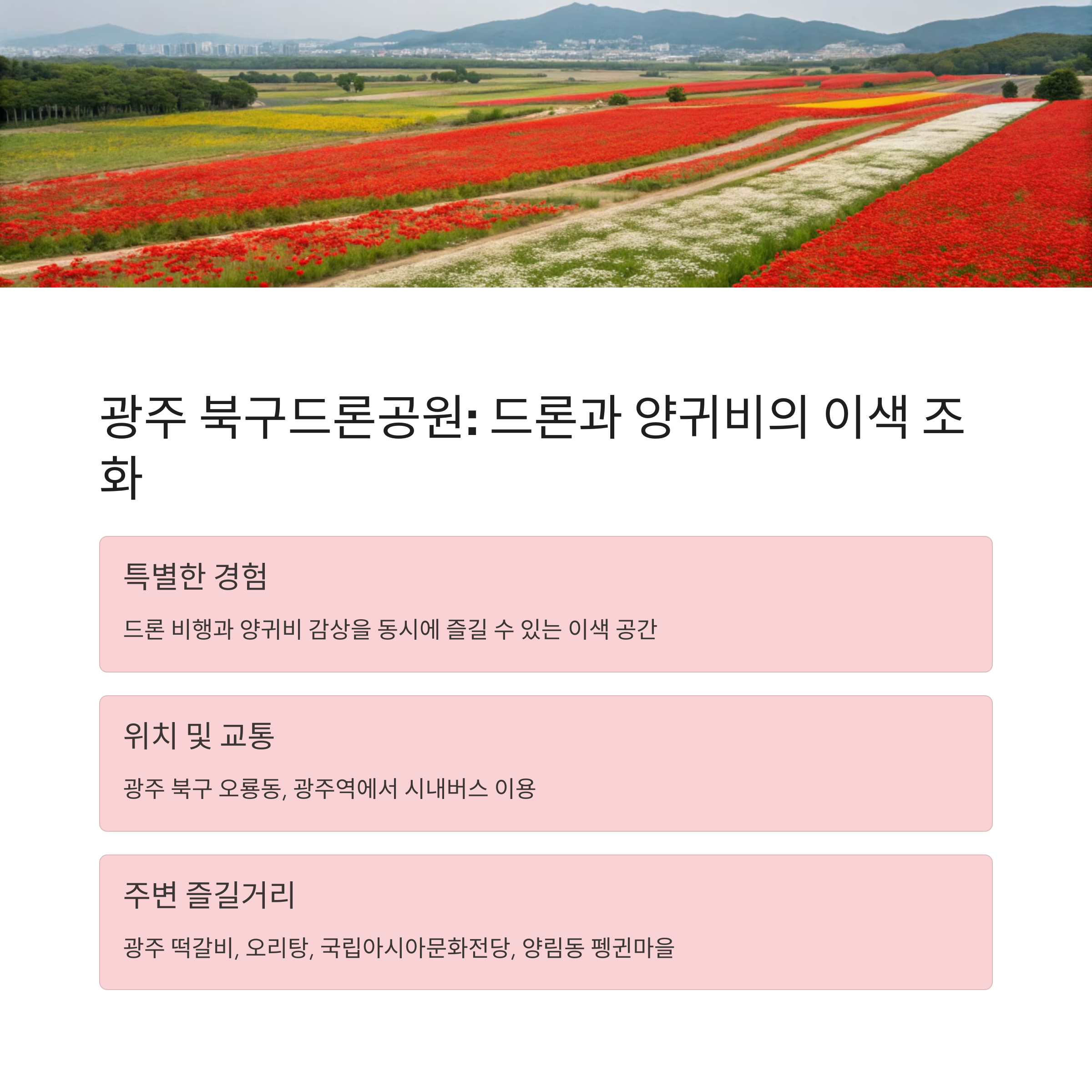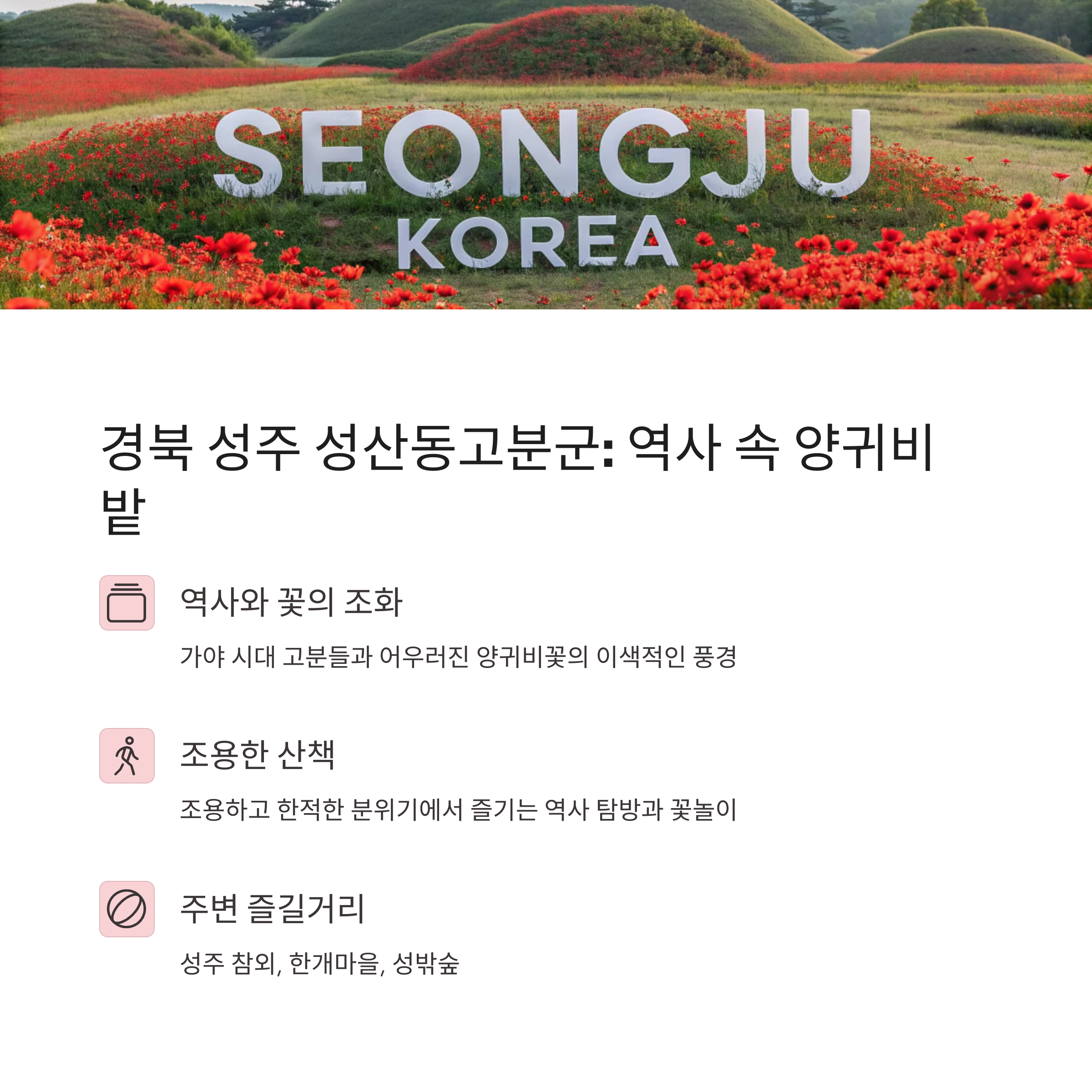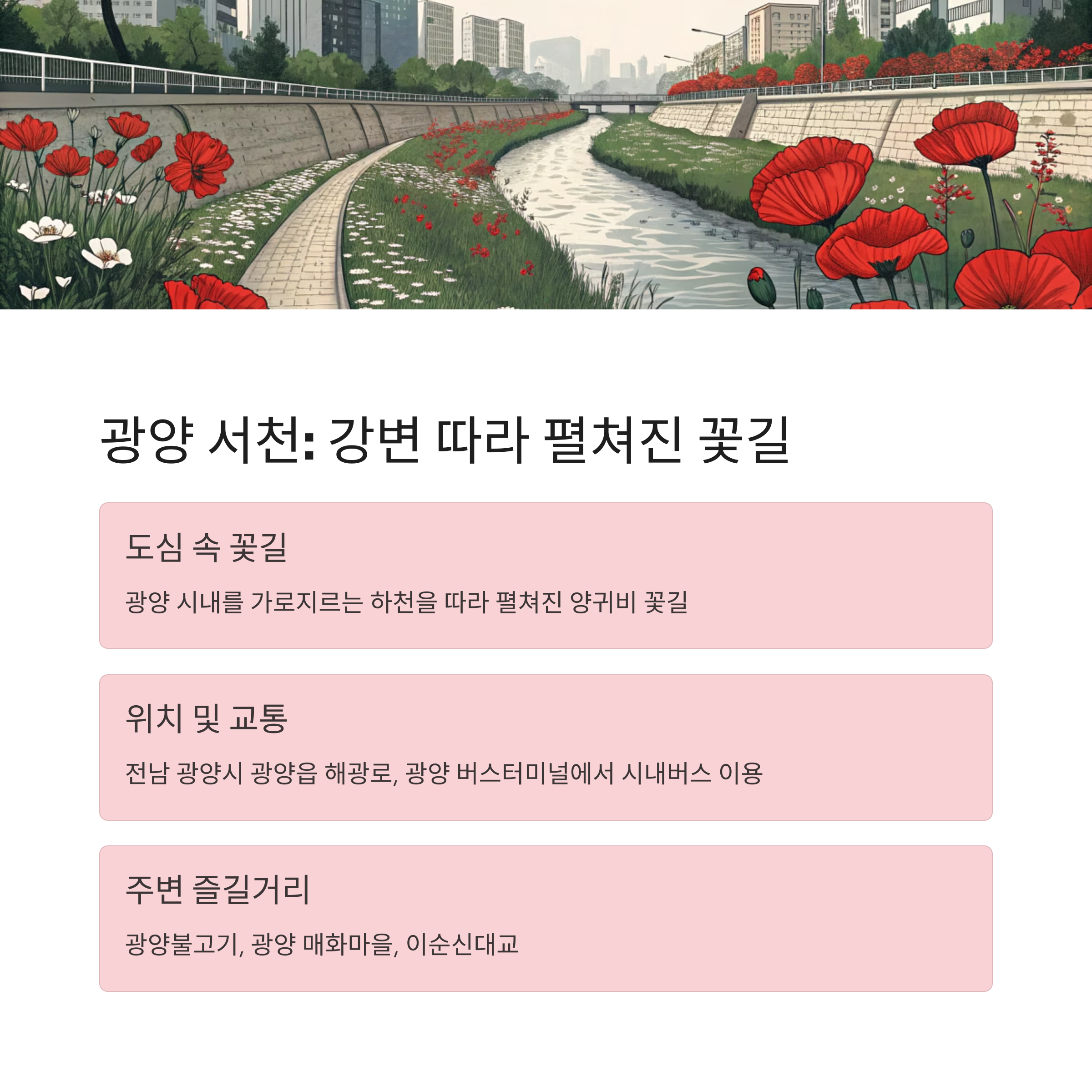 - 테마별 즐거움: 도심 속 휴식, 자연 속 힐링, 역사 유적 탐방, 강변/호수 산책, 카페 투어 등 다양한 테마로 양귀비 꽃놀이를 즐길 수 있어요.