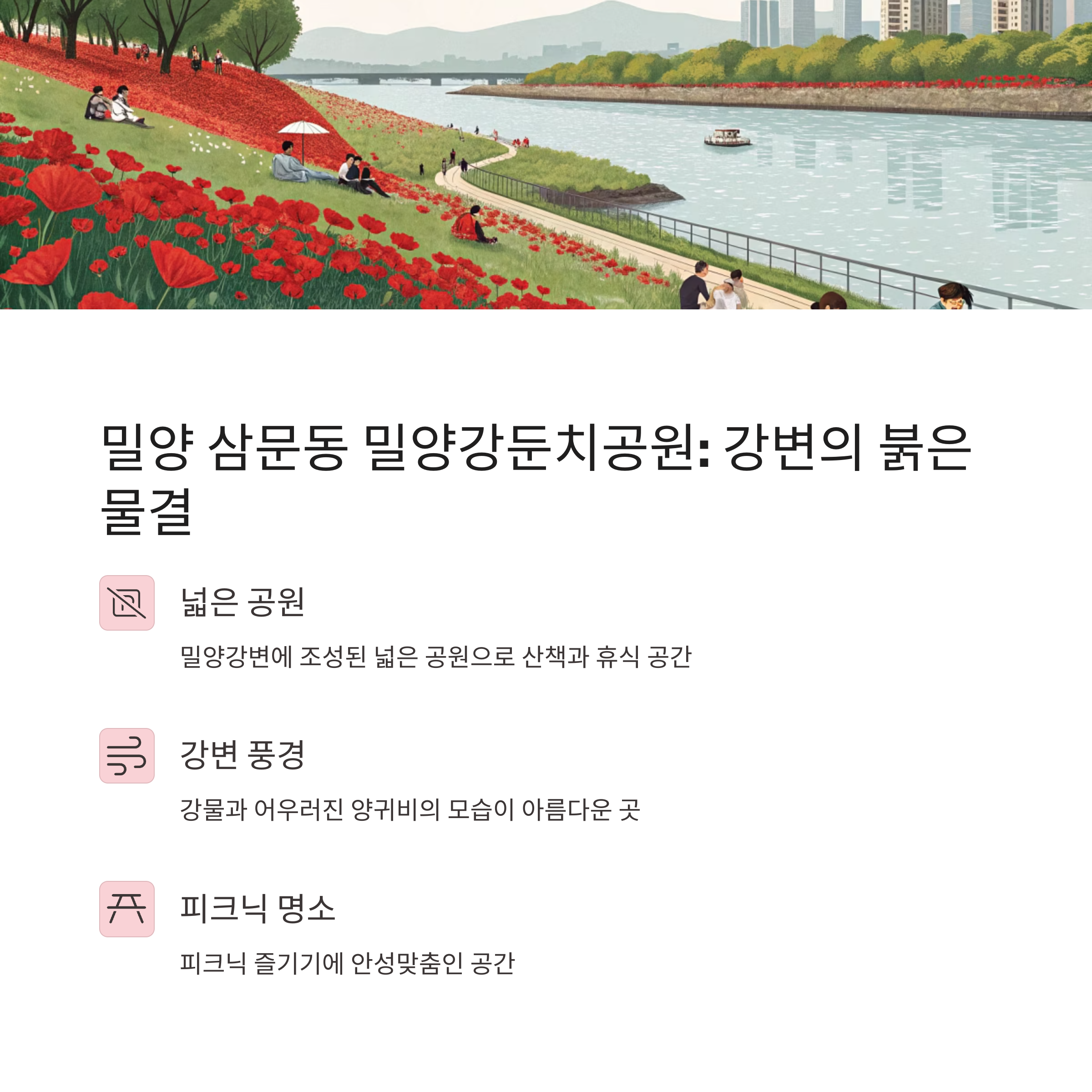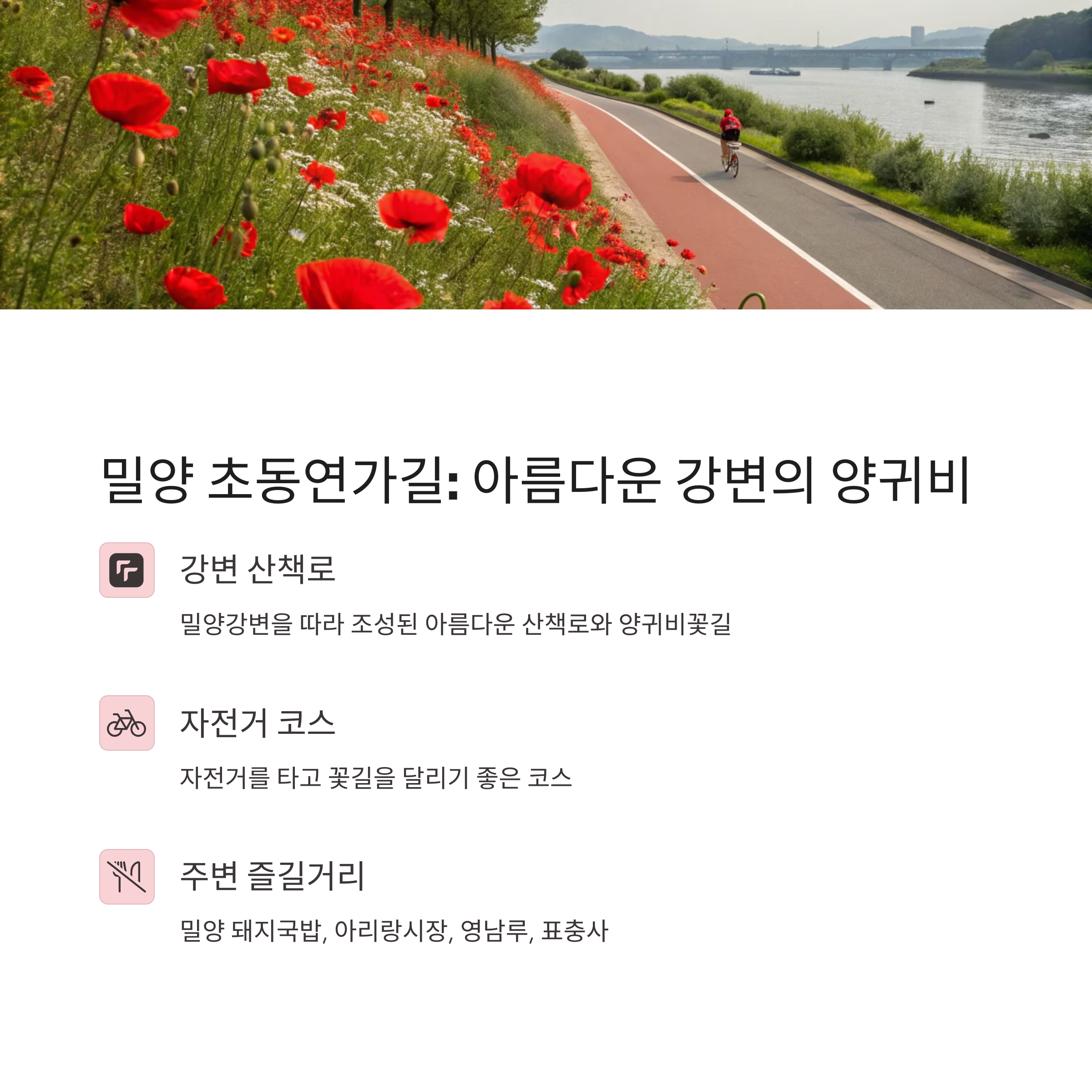 밀양 초동연가길은 밀양강변을 따라 조성된 아름다운 산책로입니다. 봄이 되면 이곳에 양귀비꽃이 만개하여 붉은 꽃길을 이룹니다. 강바람을 맞으며 꽃길을 걷는 기분이 정말 상쾌해요. "강변 산책하기 너무 좋다", "양귀비꽃이 정말 끝없이 이어져서 감탄했어요"라는 후기가 많았어요. 저는 자전거 타고 꽃길을 달려봤는데, 진짜 최고였어요! 🚴♀️