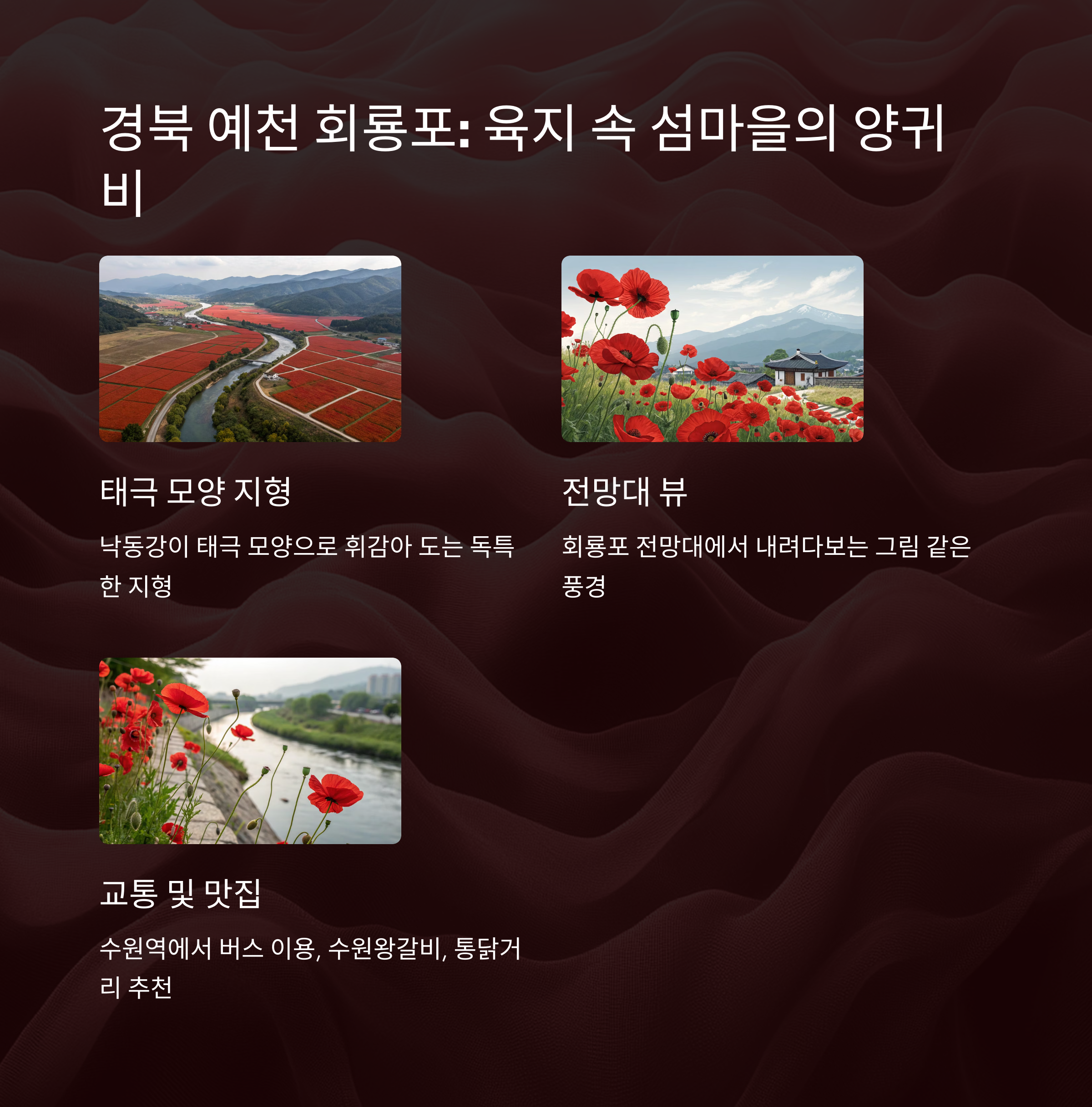 경북 예천 회룡포는 낙동강이 태극 모양으로 휘감아 도는 육지 속 섬마을로, 아름다운 자연경관을 자랑합니다. 이곳 주변에도 양귀비꽃이 피어나는 곳이 있어, 독특한 지형과 어우러지는 붉은 꽃의 아름다움을 만끽할 수 있어요. "회룡포 전망대에서 내려다보는 풍경이 정말 최고예요!", "양귀비꽃이 더해져서 그림 같은 풍경이었어요"라는 후기가 많았어요. 특별한 풍경을 찾는 분들께 강추합니다! 👍