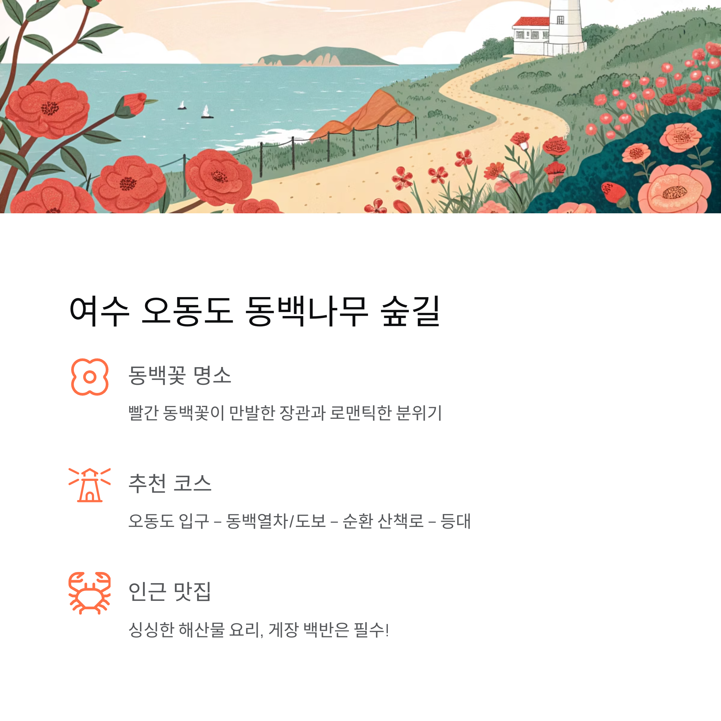 오동도는 여수 여행의 필수 코스죠! 특히 동백꽃 필 무렵에 가면 그 빨간 꽃들이 정말 장관이에요. 바닷바람 맞으면서 걷는 동백 숲길은 로맨틱 그 자체! 💑 저도 친구들이랑 가서 인생 사진 많이 찍었어요.