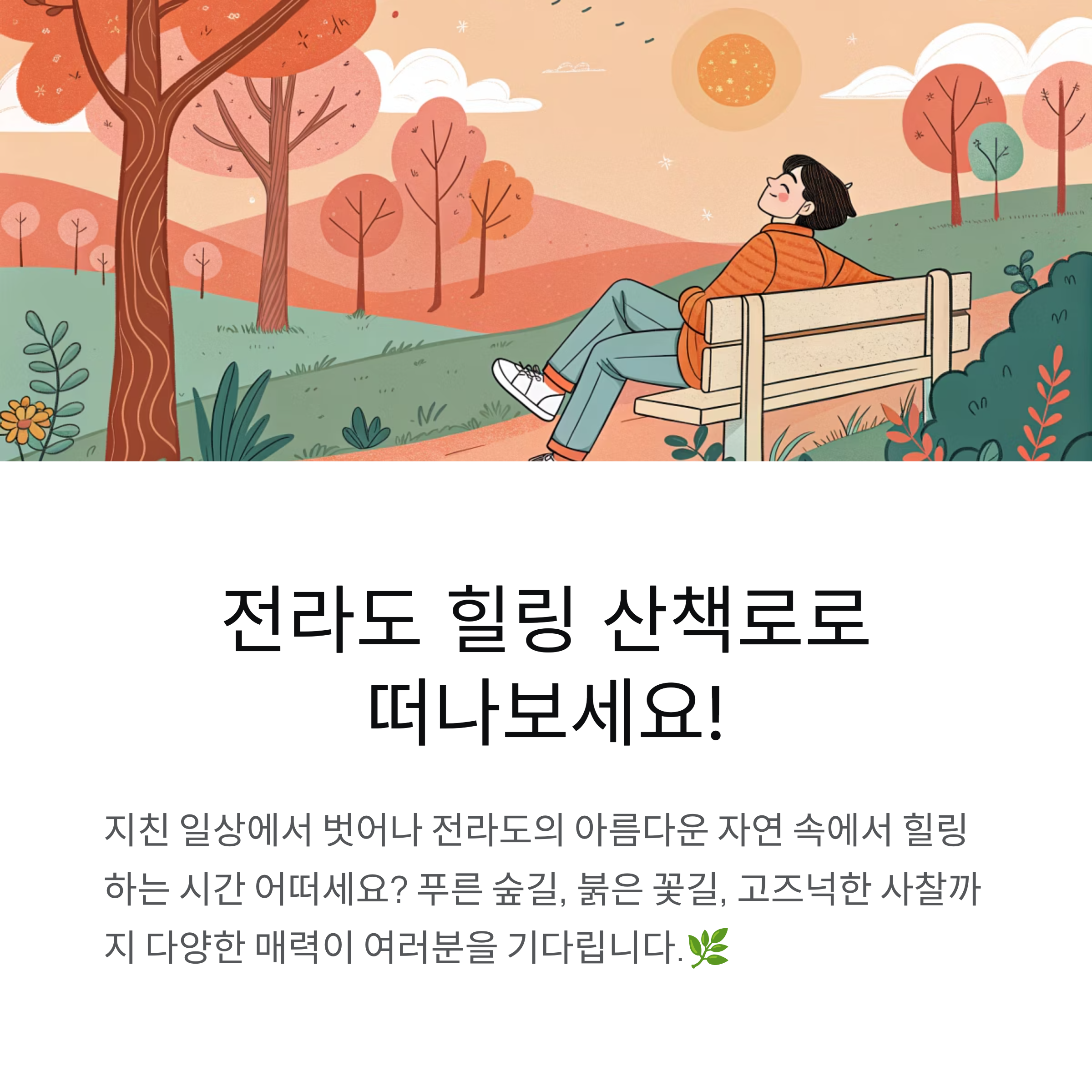 어떠셨나요? 전라도에는 정말 몸과 마음을 힐링할 수 있는 멋진 산책로들이 가득하죠? 이 글을 통해 여러분이 전라도의 아름다운 자연 속에서 편안함과 활력을 되찾으시길 바랍니다. 걷는 동안 맛있는 음식도 드시고, 아름다운 추억도 많이 만드시고요! 😊