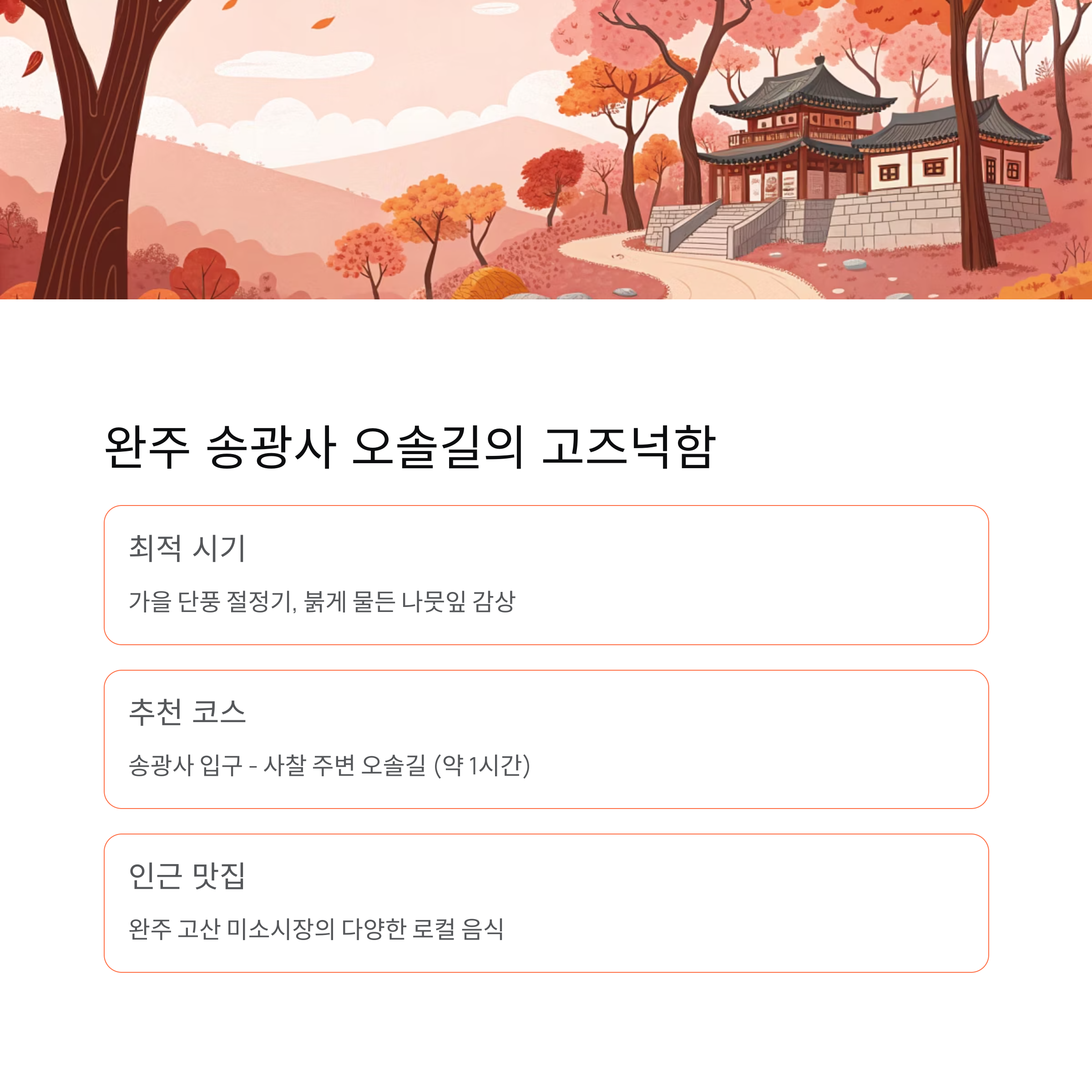 완주 송광사는 고즈넉한 사찰 분위기와 함께 아름다운 숲길을 걸을 수 있는 곳이에요. 특히 가을 단풍이 절정일 때 방문하면 붉게 물든 나뭇잎들이 정말 환상적이랍니다. 번잡하지 않아서 조용히 사색하며 걷기 좋았어요.