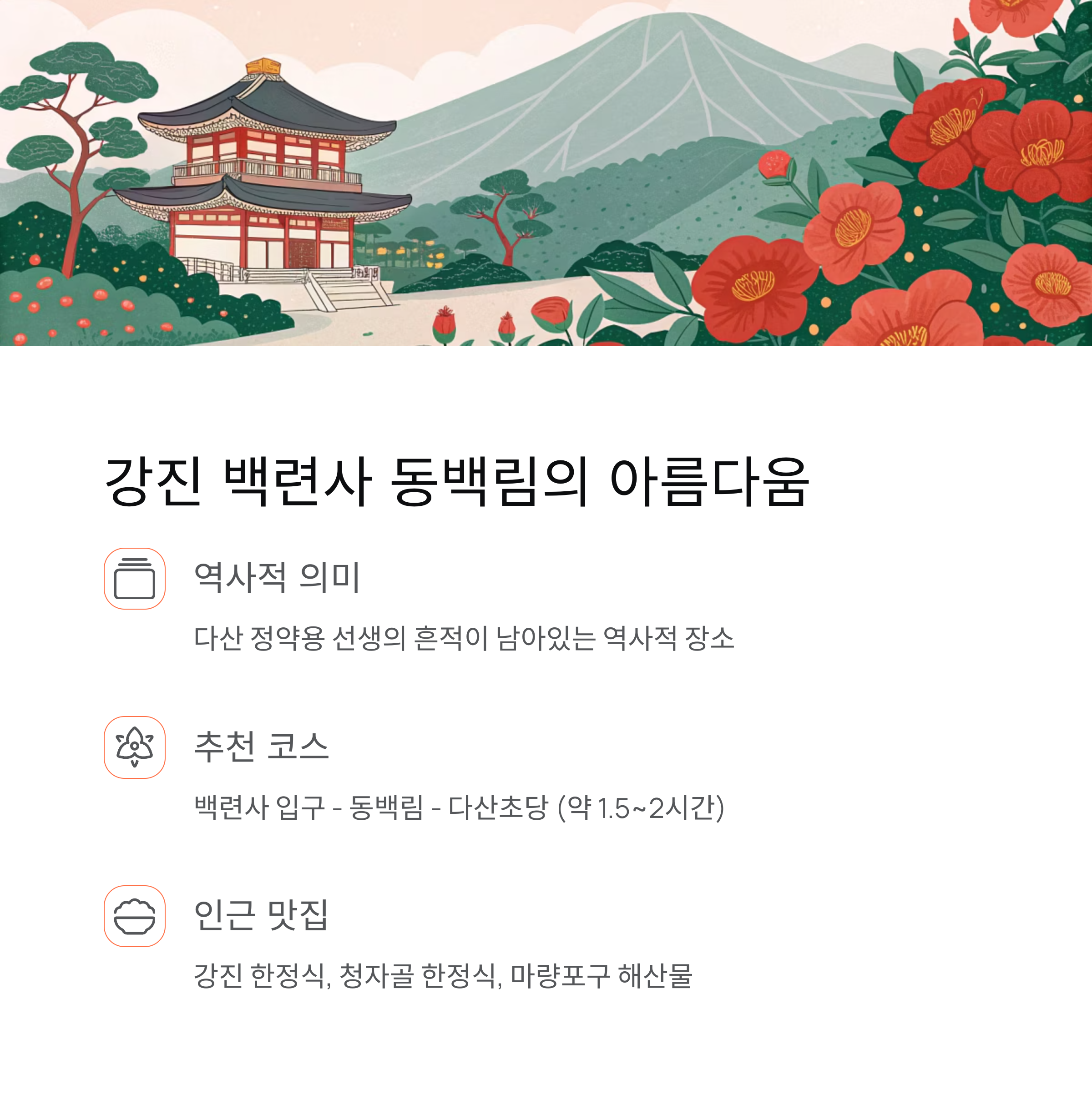 - 인근 추천 맛집: 강진은 '한정식'이 정말 유명해요. '청자골 한정식'이나 '마량포구 해산물'도 추천!