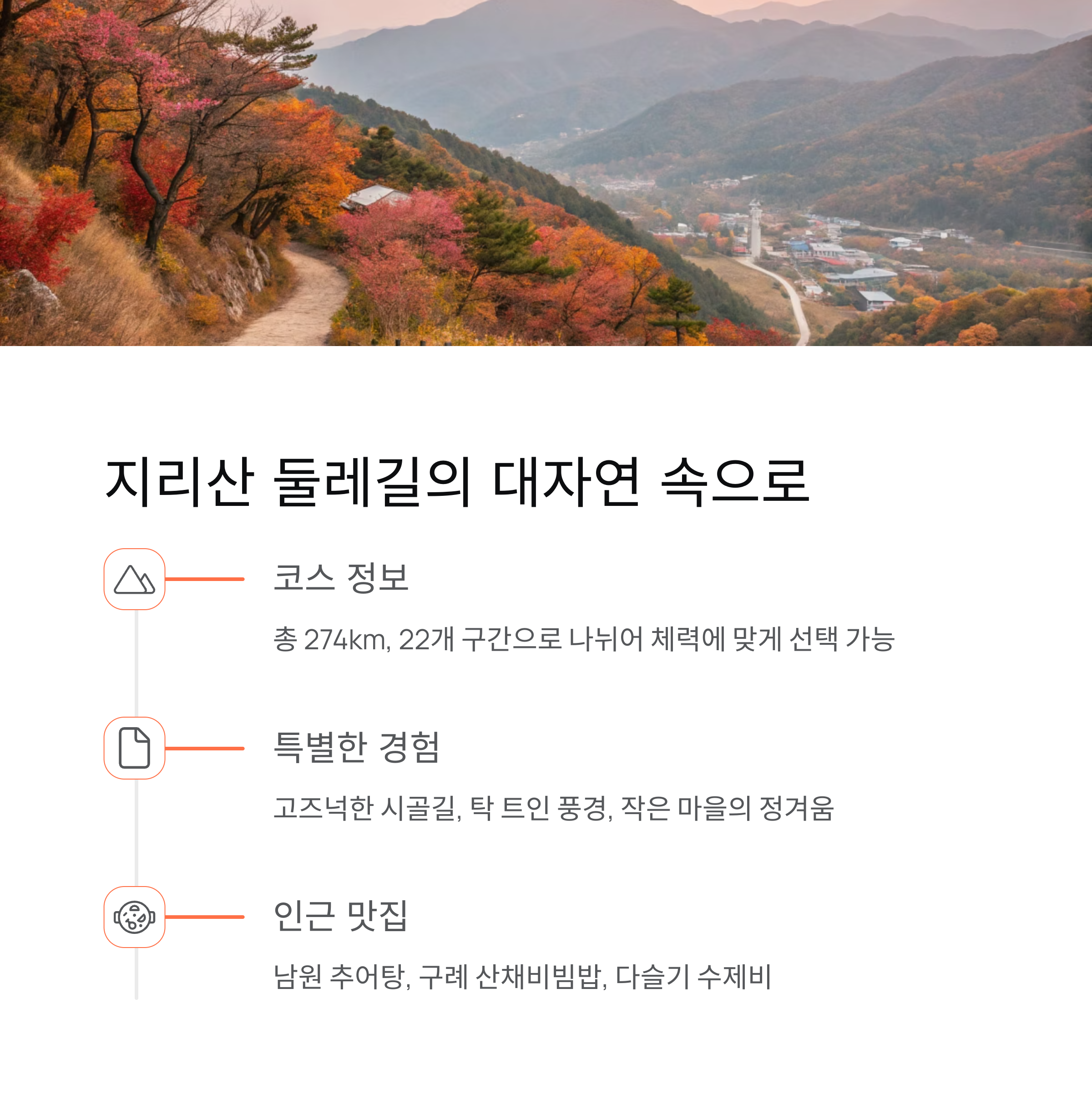 - 코스: 지리산 둘레길은 총 274km, 22개 구간으로 나뉘어 있으니 원하는 구간 선택 (예: 남원 주천-운봉 구간 약 14.3km, 5시간 소요)