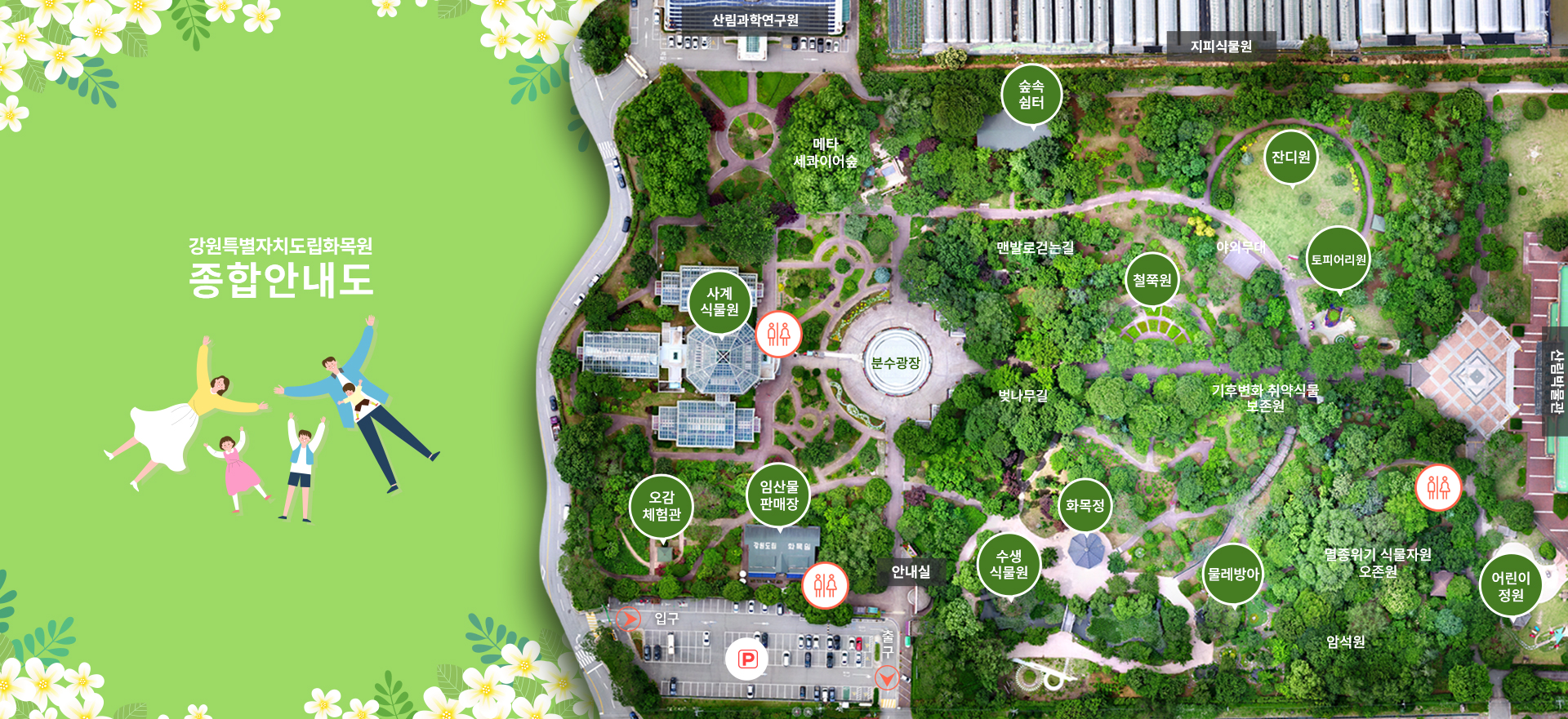 - 관엽식물원, 난대식물원, 생태관찰원, 다육식물원: 희귀하고 이색적인 식물들을 만나볼 수 있습니다.