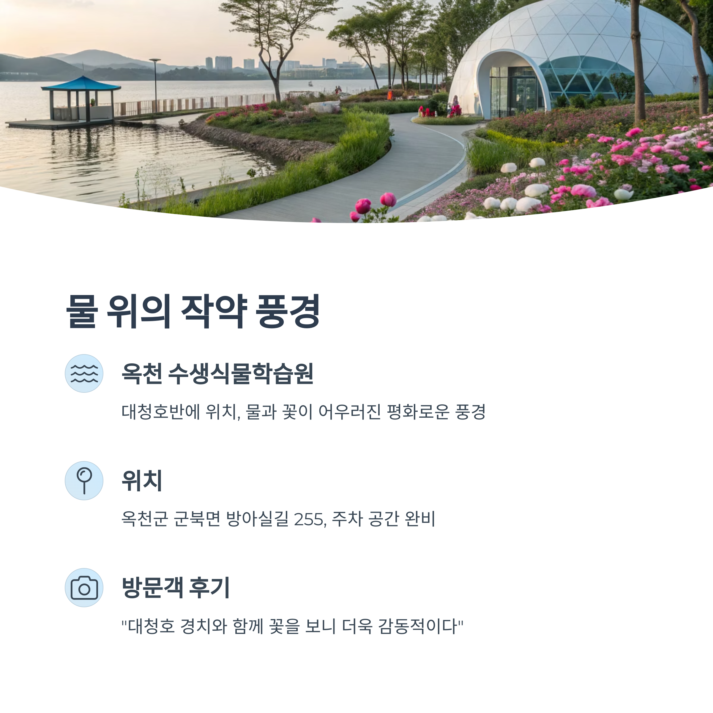- 인근 추천 맛집: 옥천 읍내에는 올갱이 해장국, 생선국수 등 향토 음식 맛집들이 있습니다. 대청호 주변의 카페나 음식점을 이용하는 것도 좋습니다.