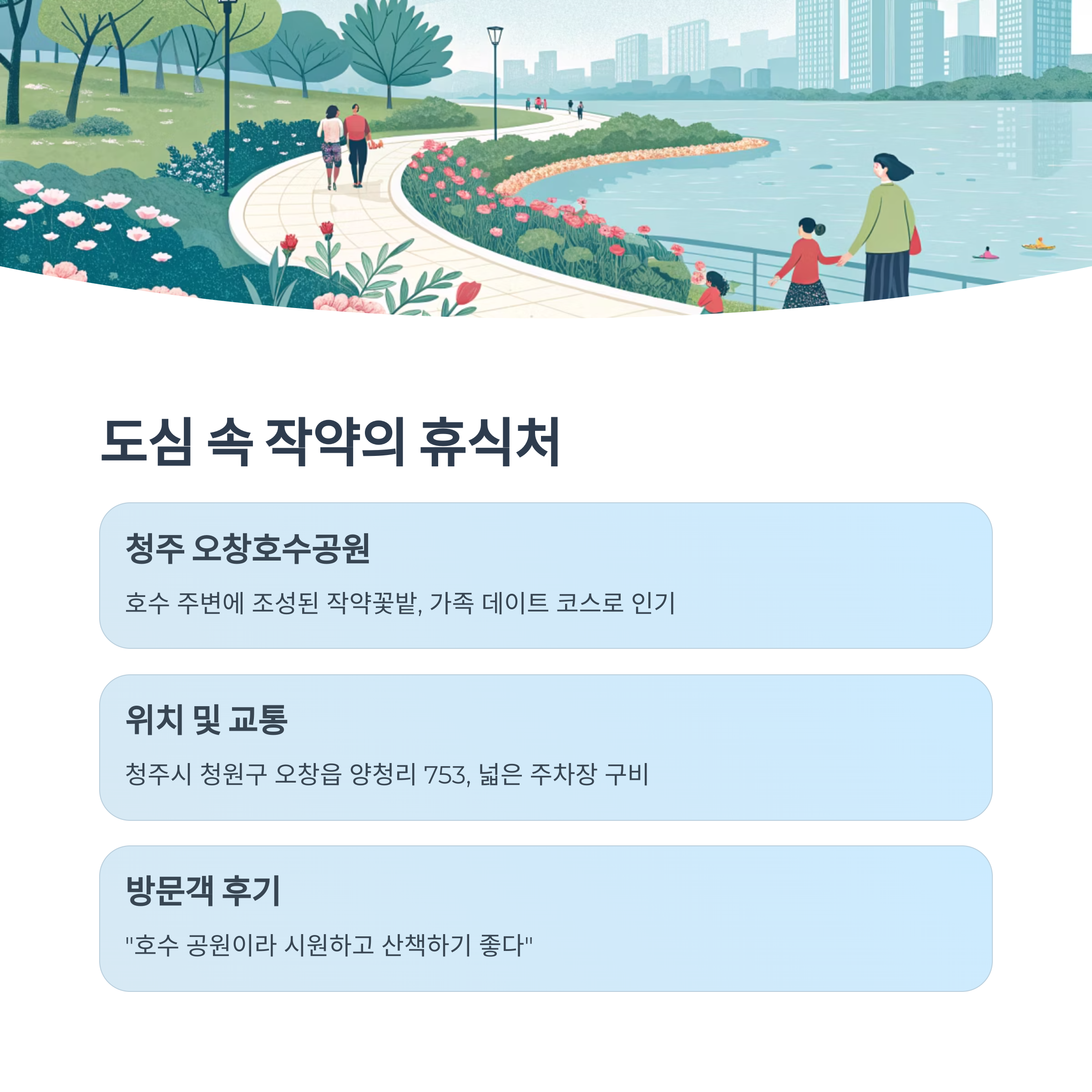 - 자가용: 네비게이션에 '오창호수공원' 검색. 공원 주변에 넓은 주차장이 마련되어 있습니다.