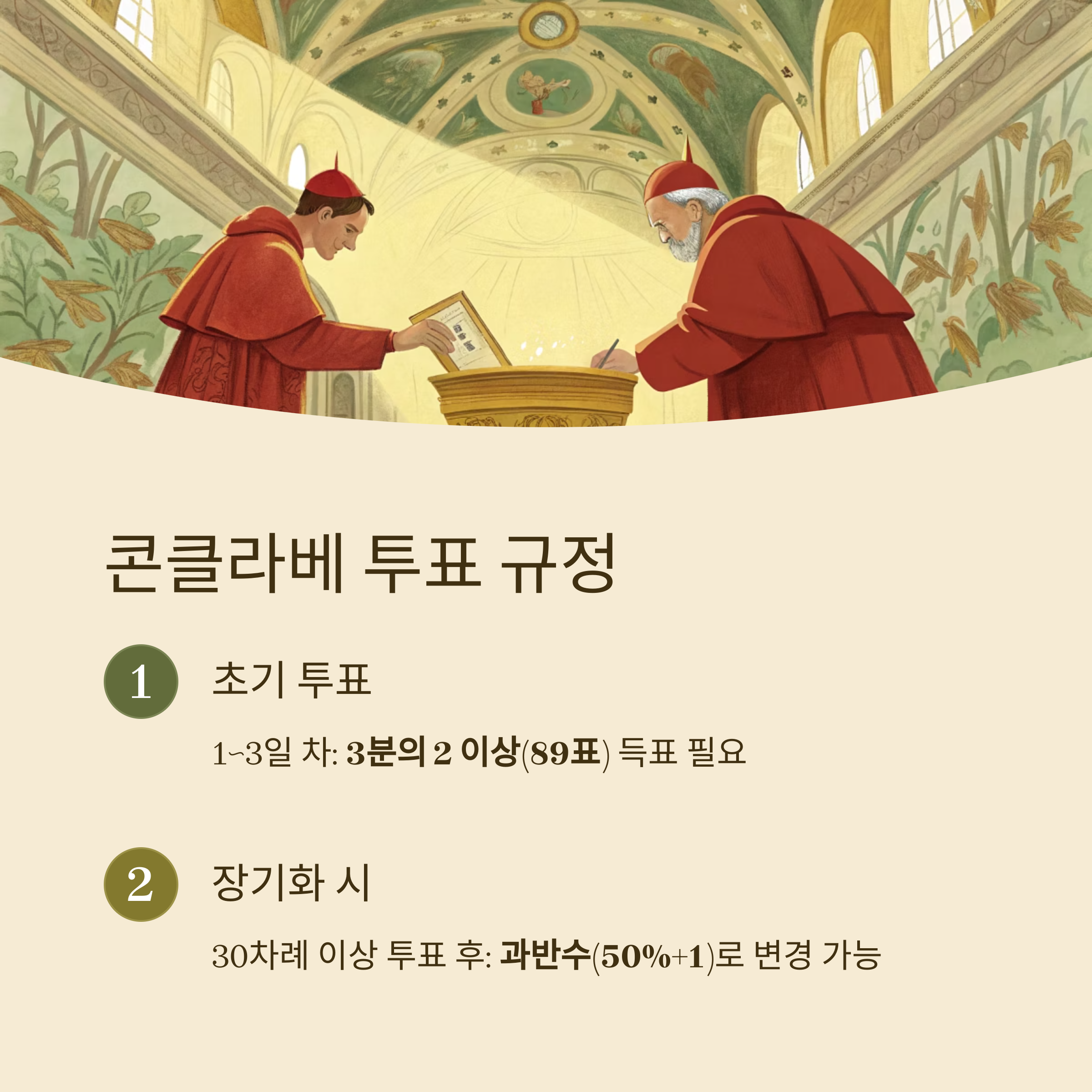 - 4일 차 이후 투표: 30차례 이상 투표 후에도 미결정 시, **과반수(50% + 1표)**로 변경 가능(단, 추기경단의 3분의 2 동의 필요).