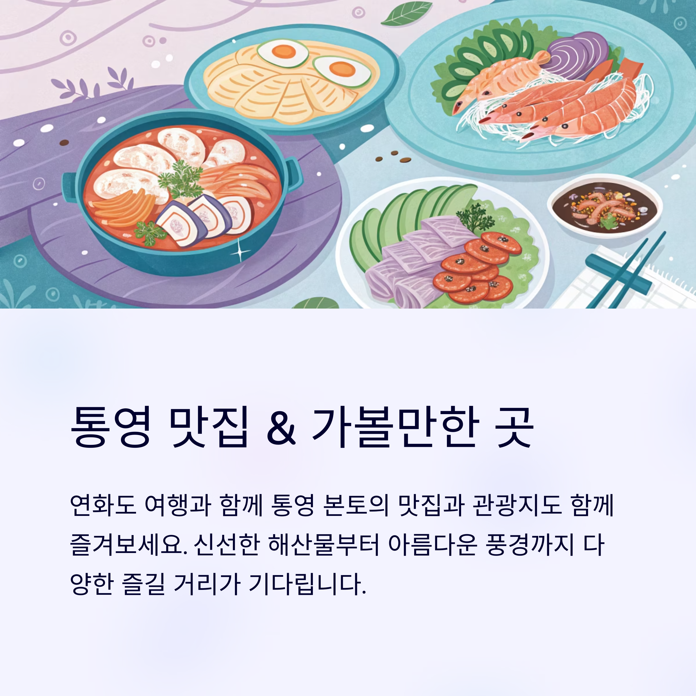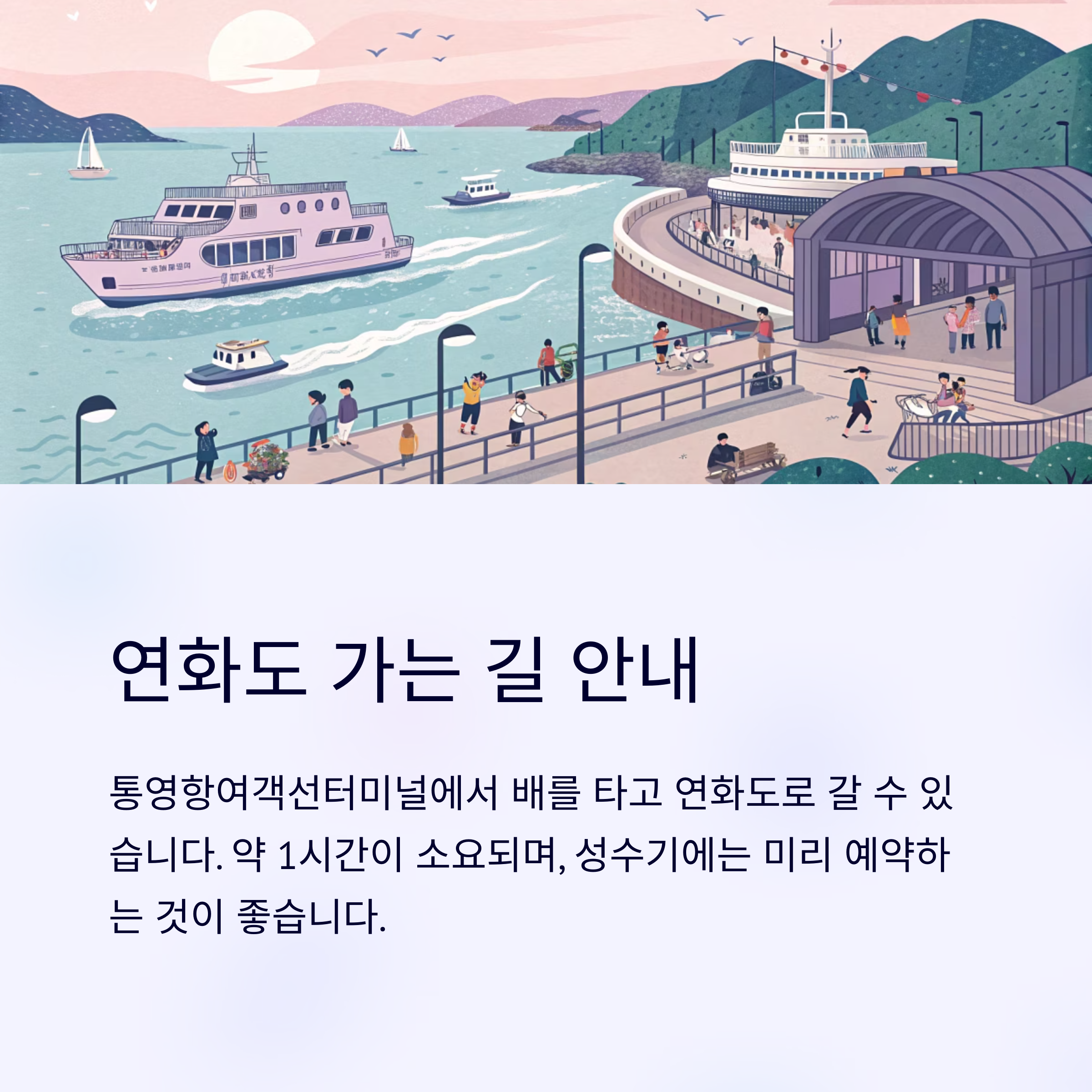 - 통영 본토 여행과 연계: 연화도 방문 전후로 통영 시내의 다양한 관광지와 맛집을 함께 즐길 수 있어 더욱 풍성한 여행이 됩니다.
