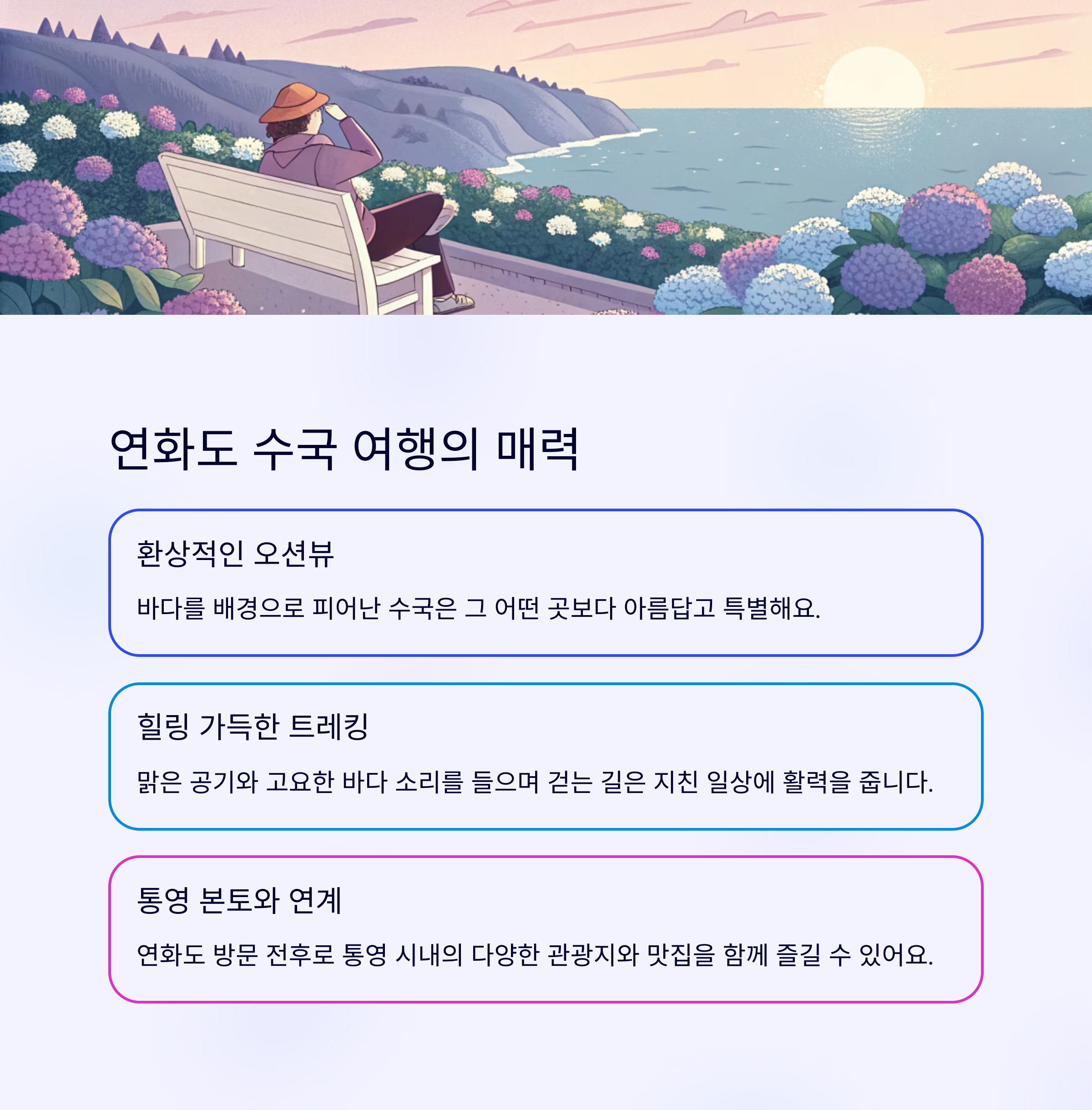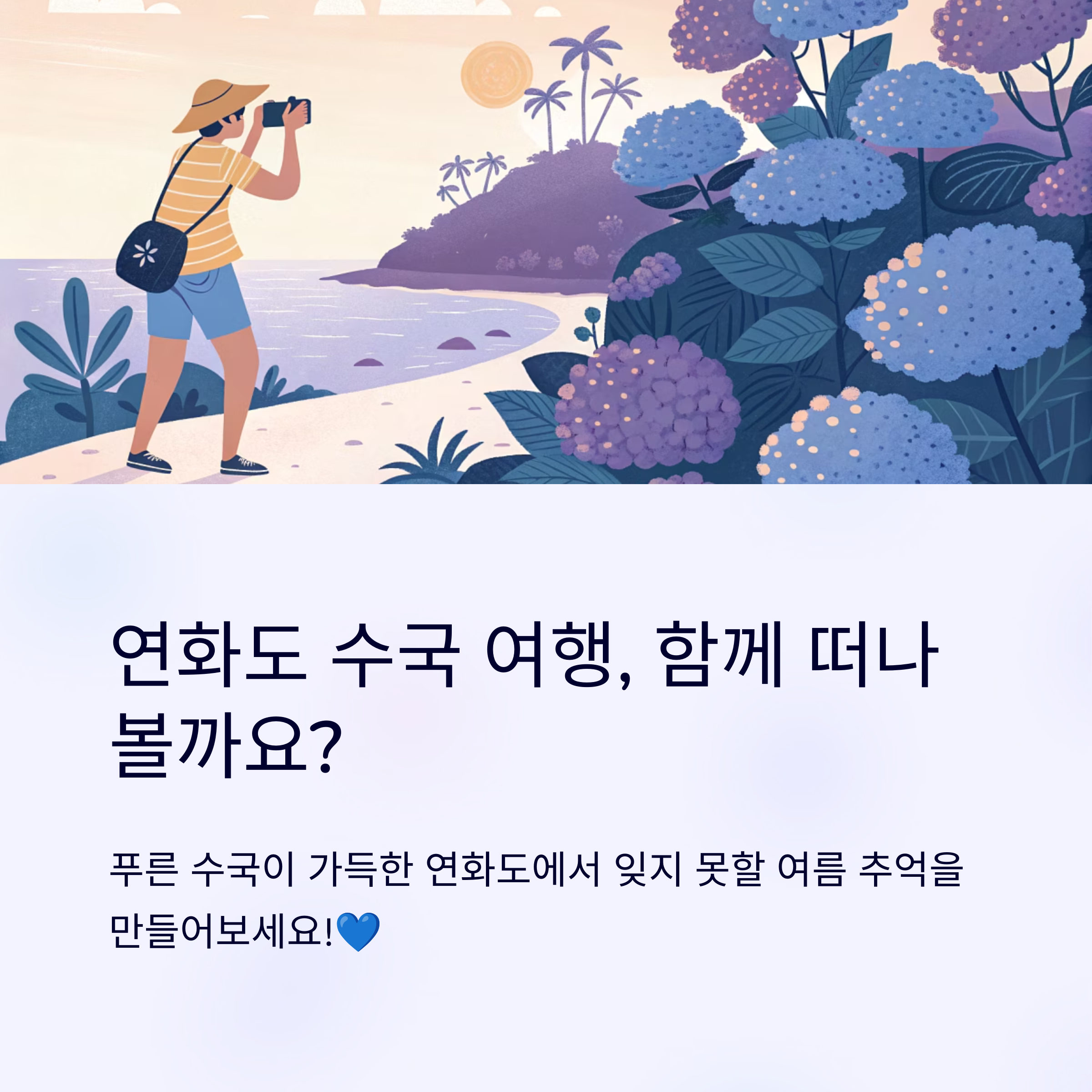 통영 연화도, 어떠셨나요? 푸른 수국이 가득한 섬에서 잊지 못할 여름 추억을 만들어보시길 바랍니다! 더 궁금한 점이 있다면 언제든지 댓글로 물어봐주세요~ 😊