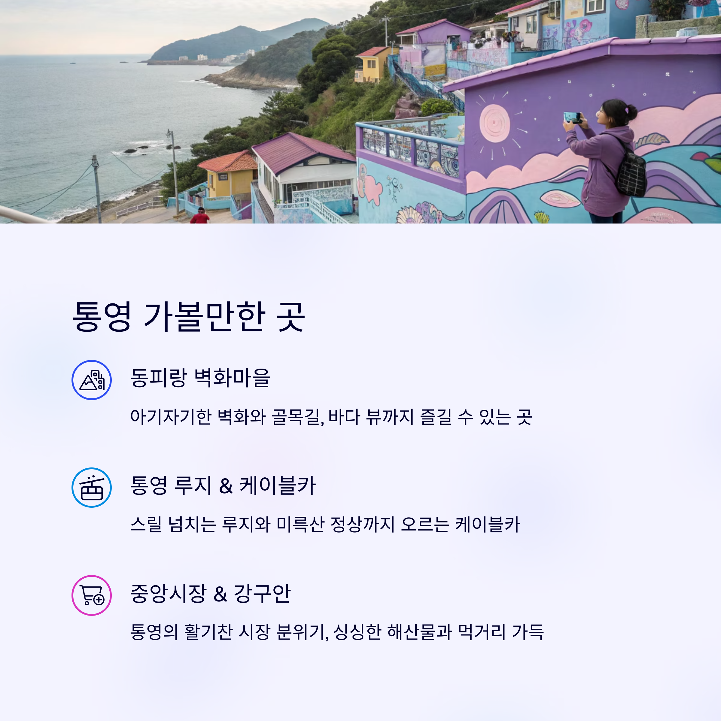 - 동피랑 벽화마을 / 서피랑 마을: 아기자기한 벽화와 골목길을 따라 걷는 재미가 쏠쏠합니다. 바다 뷰는 덤!