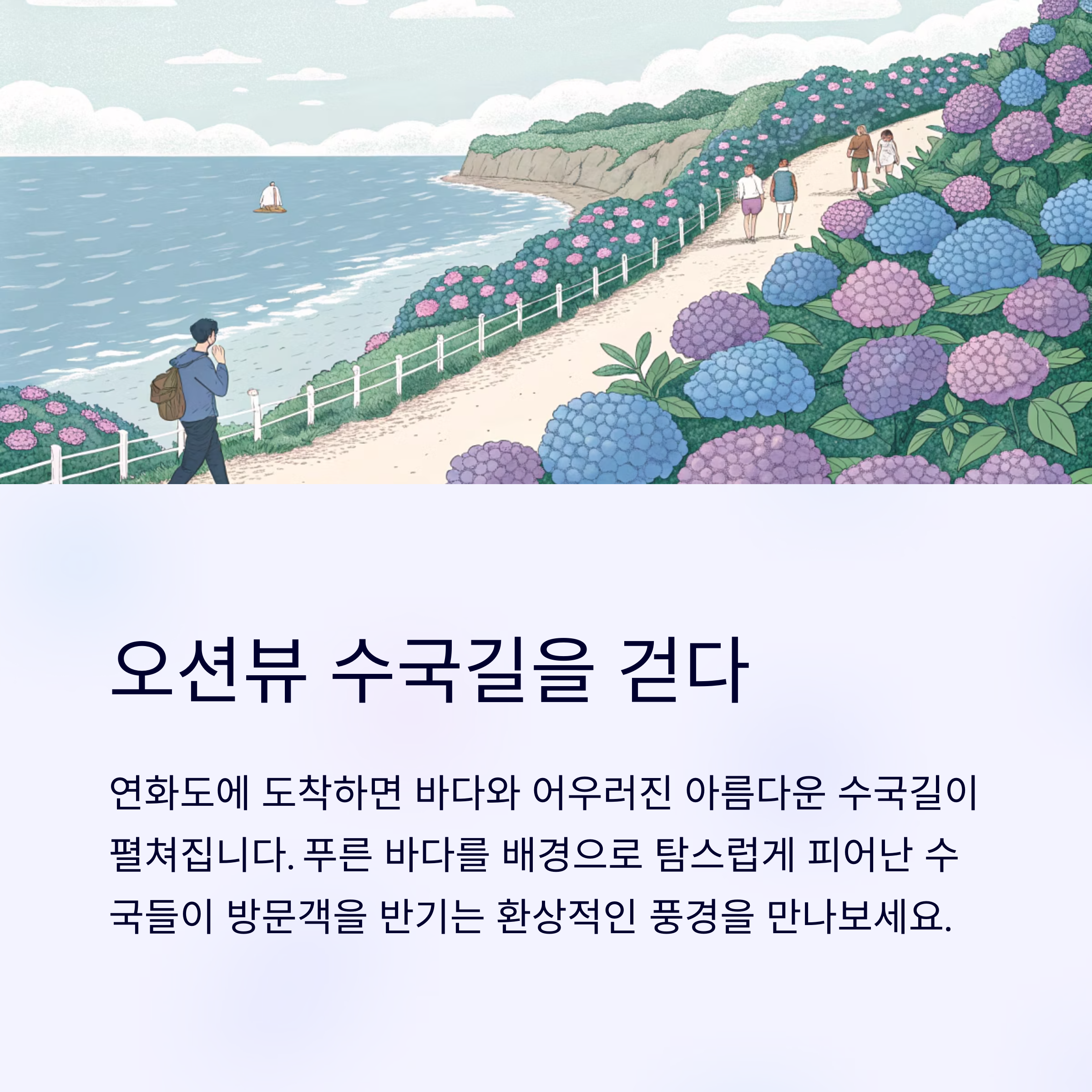- 환상적인 오션뷰 수국길: 바다를 배경으로 피어난 수국은 그 어떤 곳보다 아름답고 특별해요.
