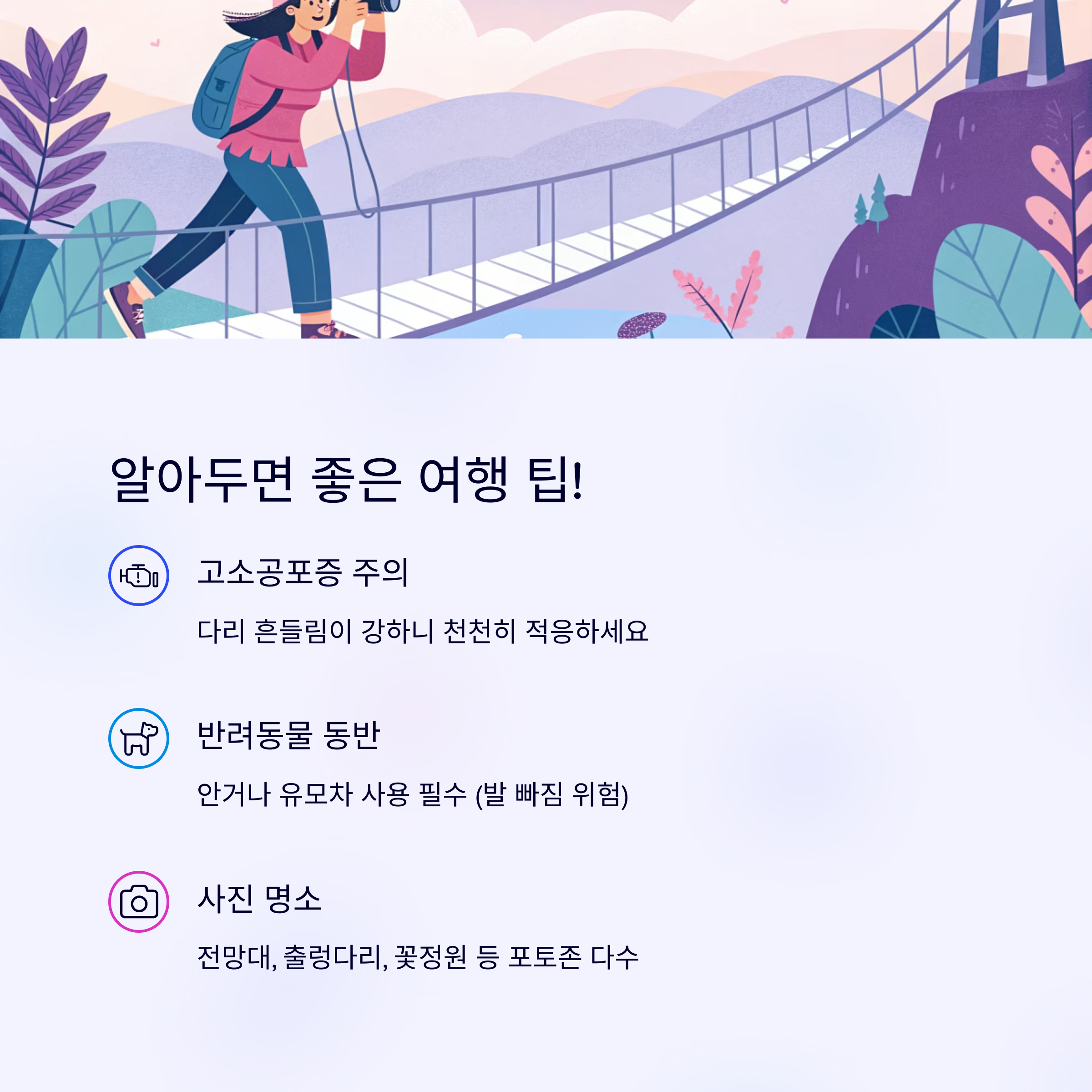 - 고소공포증 주의: 다리 흔들림이 강해 처음엔 긴장될 수 있음, 적응하면 괜찮음