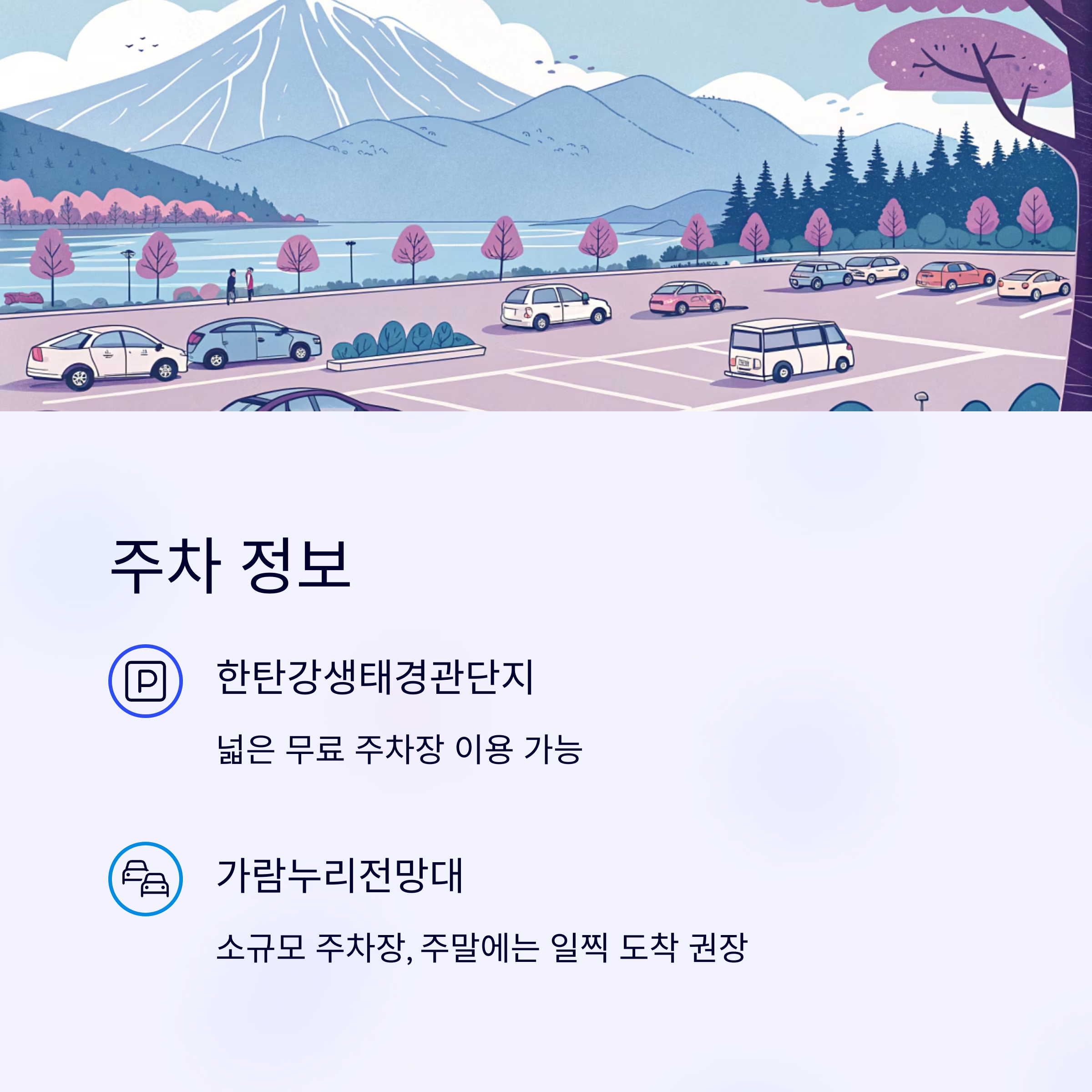 - 주말 혼잡: 오전 일찍 방문하면 쾌적, 주차장 만차 시 갓길 주차