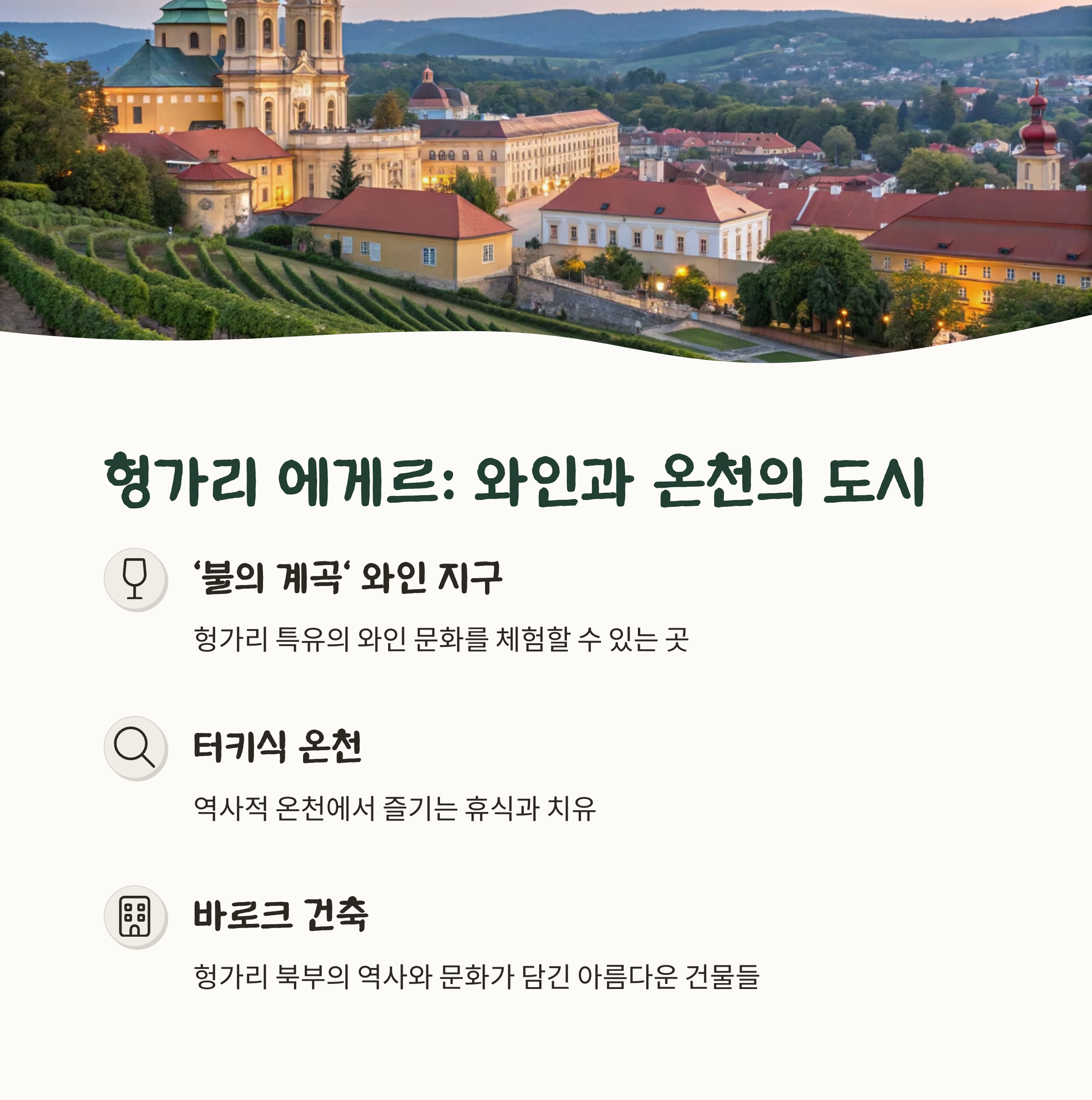 온천, 와인, 바로크 건축이 어우러진 헝가리 북부의 역사 도시.