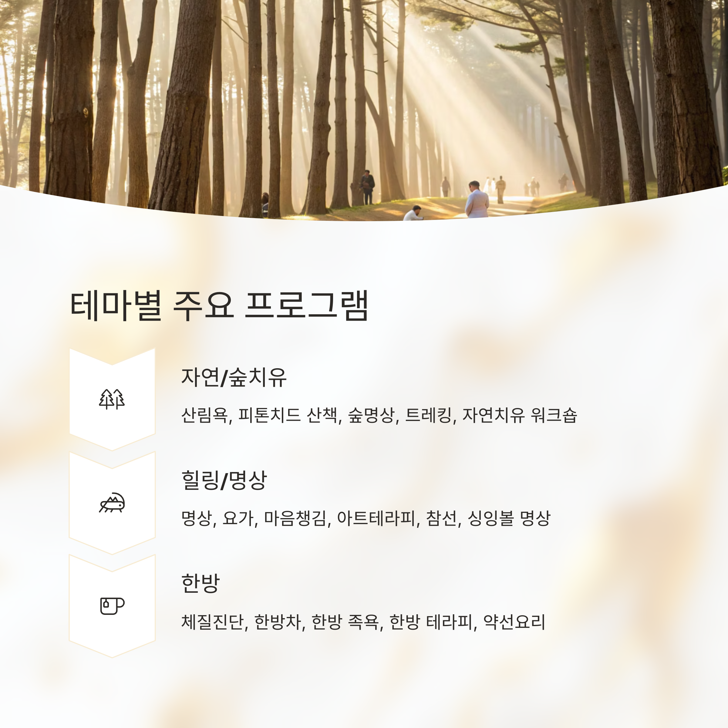 - 자연/숲치유: 산림욕, 피톤치드 산책, 숲명상, 트레킹, 자연치유 워크숍